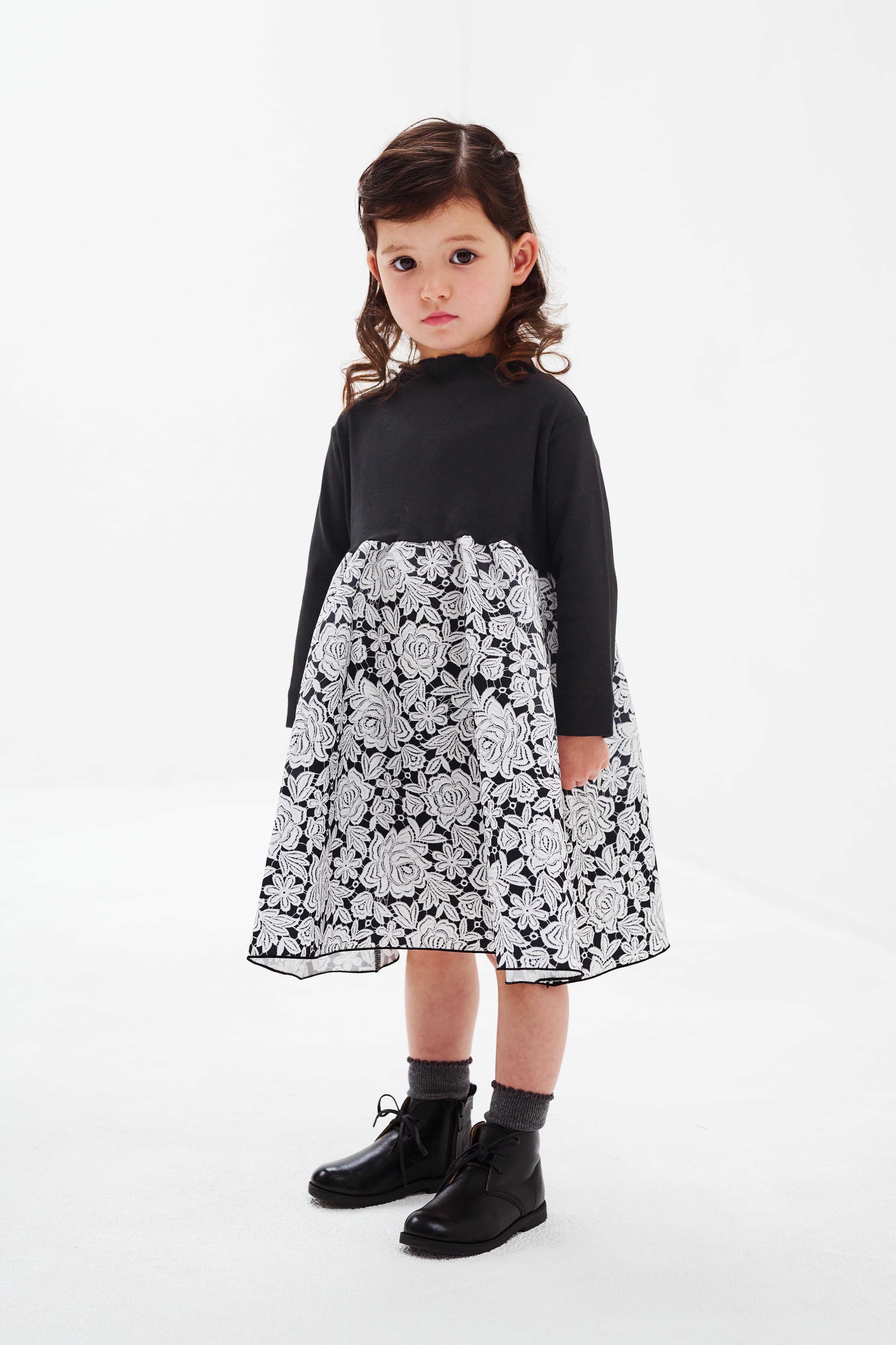 繊細なレースはキッズたちには扱いにくく、モノトーンでシックに仕上がったレースプリントは大人ぽさが際だつお出かけワンピースに仕上がっています。かぶりのワンピースなので、着せ方も簡単なうえに、身頃のジャージ素材もソフトで着心地抜群。