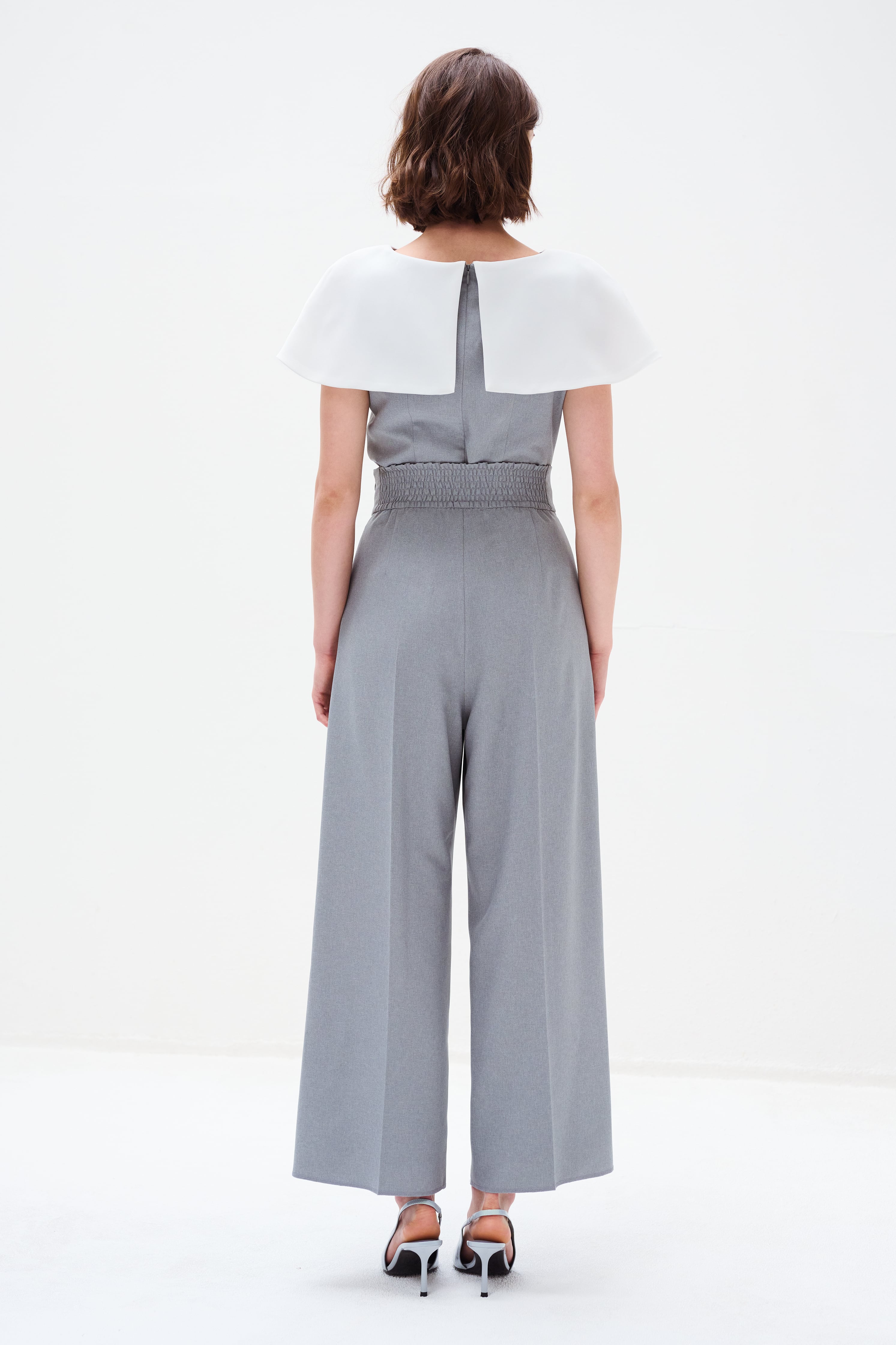 ウエストからヒップを綺麗にみせるためハイウエストにし、バックラインをすっきり見せてくれるシルエットになっております。程よいワイド感が脚を細く見せてくれます。ハイウエストでも苦しくない工夫を施しております。