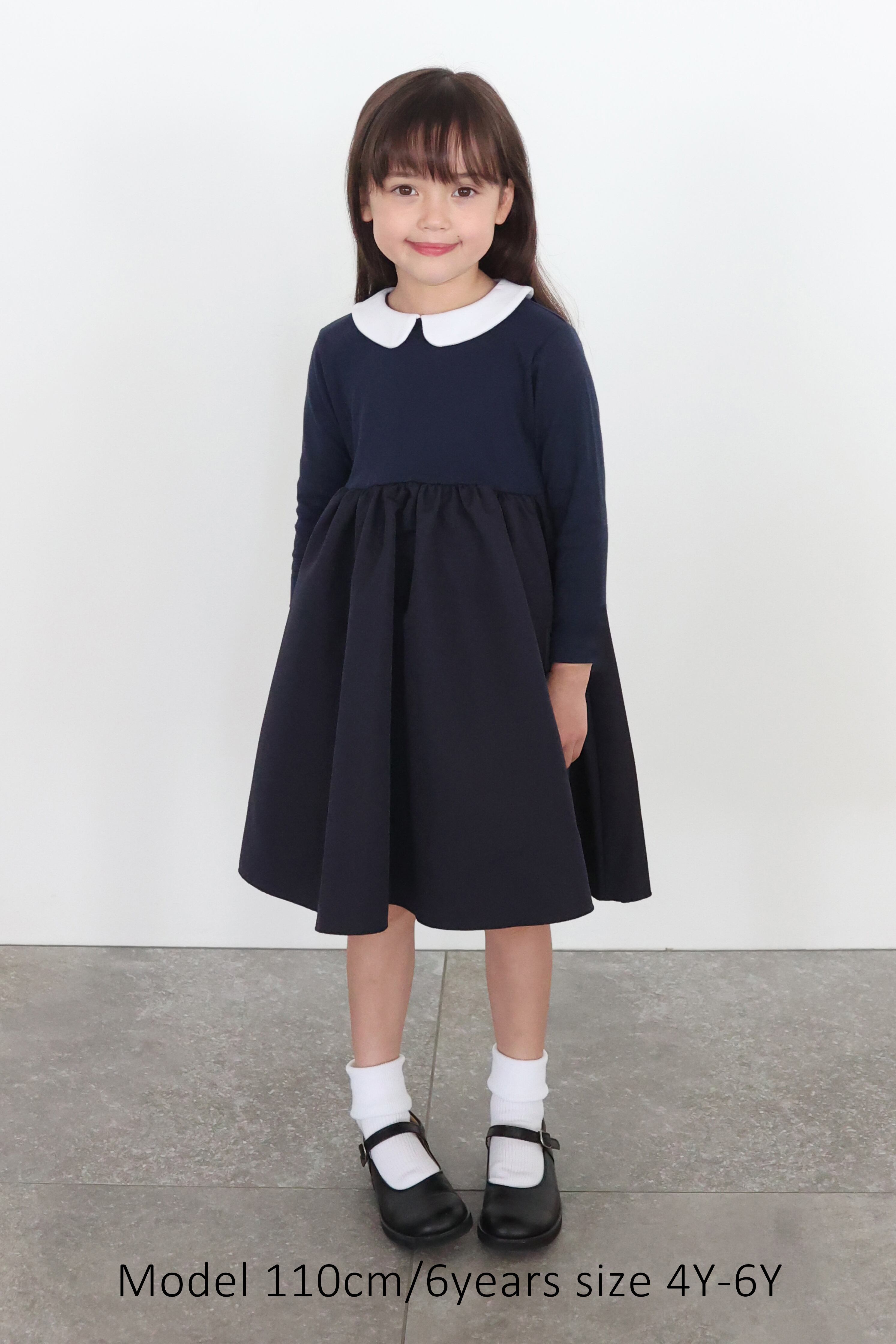 着心地でご機嫌が左右されるキッズのために、身頃素材は動きやすいストレスのない伸縮性に優れたジャージーを使用。スカート部分はふわっと広がる光沢のグログラン素材。一枚で日常をドレスアップできます。忙しいママに優しい、シワになりにくく、速乾性、接触冷感機能あり、ご自宅の洗濯機でホームクリーニングしても乾きやすく、綺麗に保たれる上質な素材を厳選。ネイビーはシックな雰囲気になり、大人っぽく仕上がります。