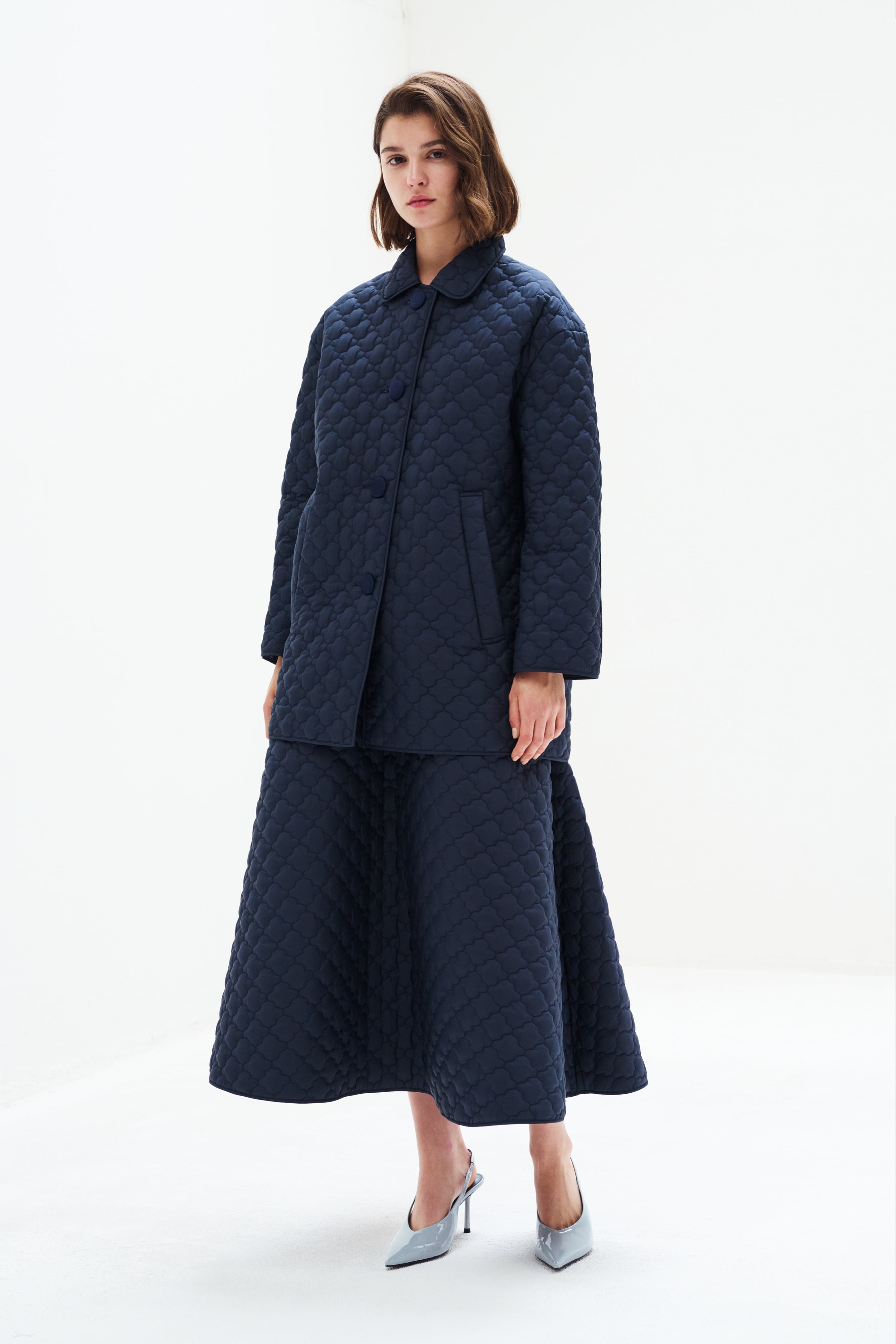 カジュアルに見えがちなキルティングを綺麗にお召しいただけるよう、繊細できめ細かい生地を厳選。オールパイピングで、サテンのくるみボタンを使用。どんな身長の方でもバランスがとりやすいコクーンコートに仕上げております。きめ細やかな生地を使用しているため、撥水加工なしで、雨の日も汚れが付きにくく、安心してお召しいただけます。【*汚れが付かないことを保証するものではありません。汚れがついた場合は速やかに拭き取り、汚れに応じた対応をお願いいたします】秋から春先の季節の変わり目に軽やかに羽織れる、セットアップのスカートとも相性がよいです。