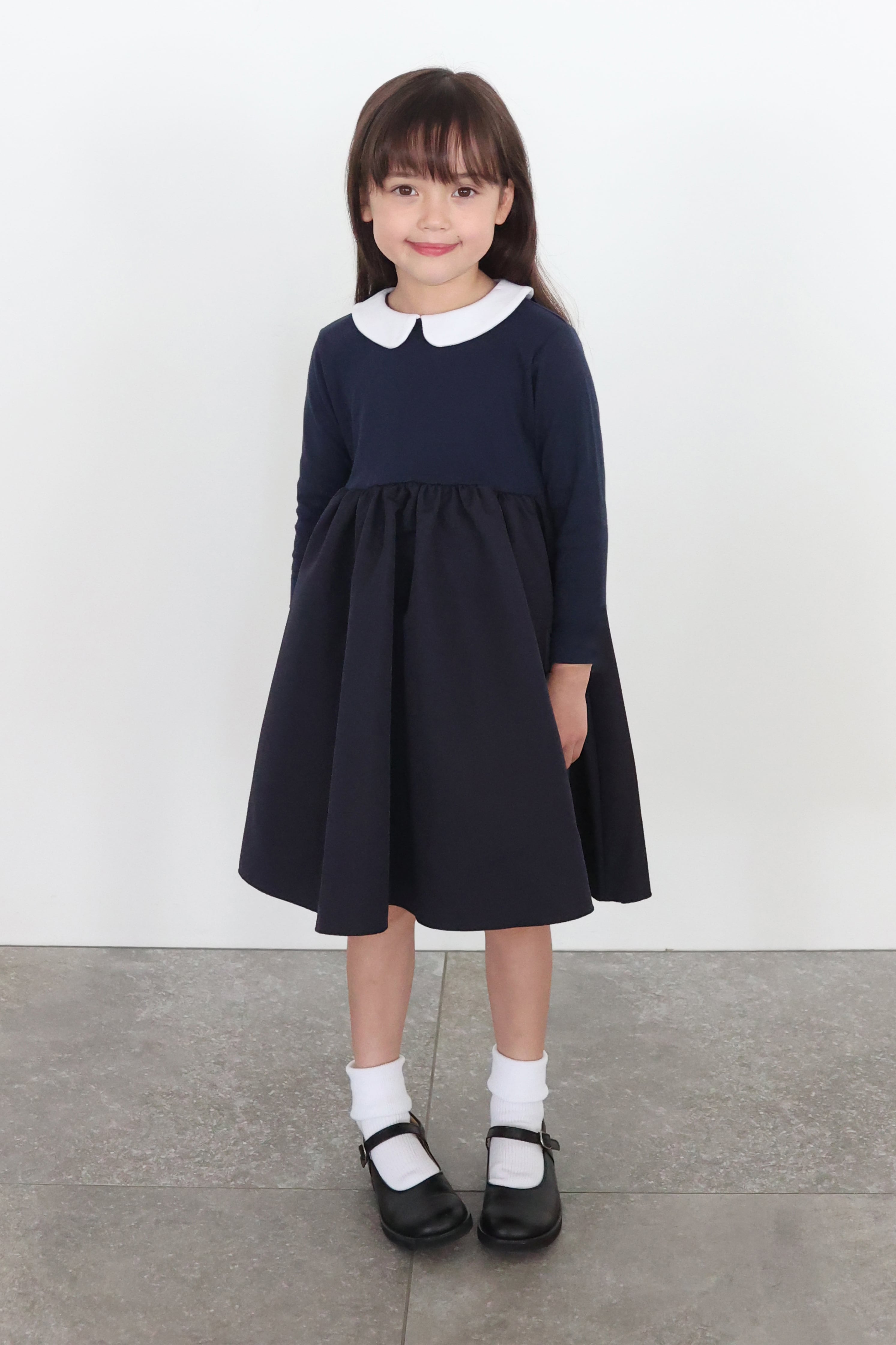 着心地でご機嫌が左右されるキッズのために、身頃素材は動きやすいストレスのない伸縮性に優れたジャージーを使用。スカート部分はふわっと広がる光沢のグログラン素材。一枚で日常をドレスアップできます。忙しいママに優しい、シワになりにくく、速乾性、接触冷感機能あり、ご自宅の洗濯機でホームクリーニングしても乾きやすく、綺麗に保たれる上質な素材を厳選。ネイビーはシックな雰囲気になり、大人っぽく仕上がります。