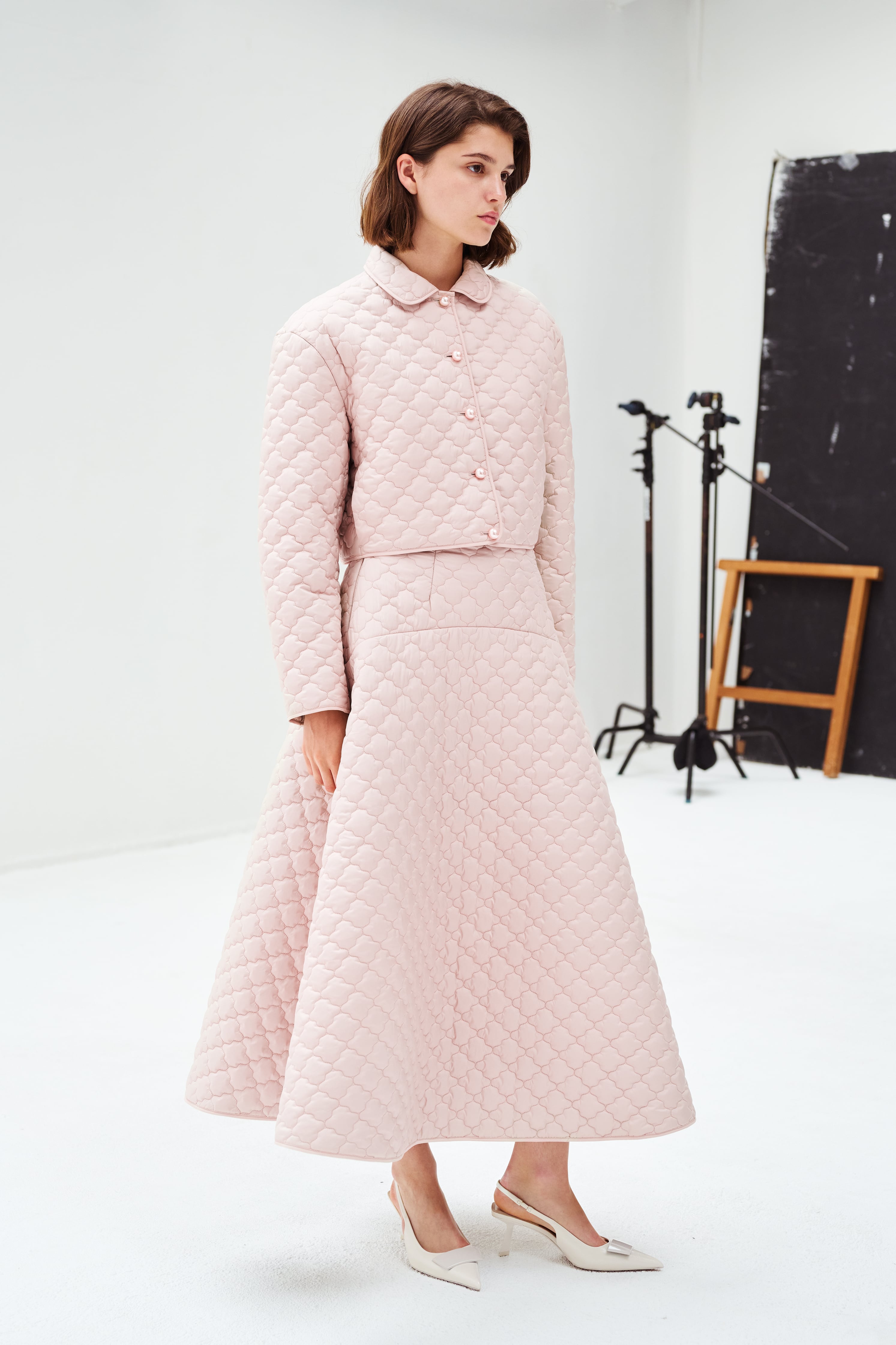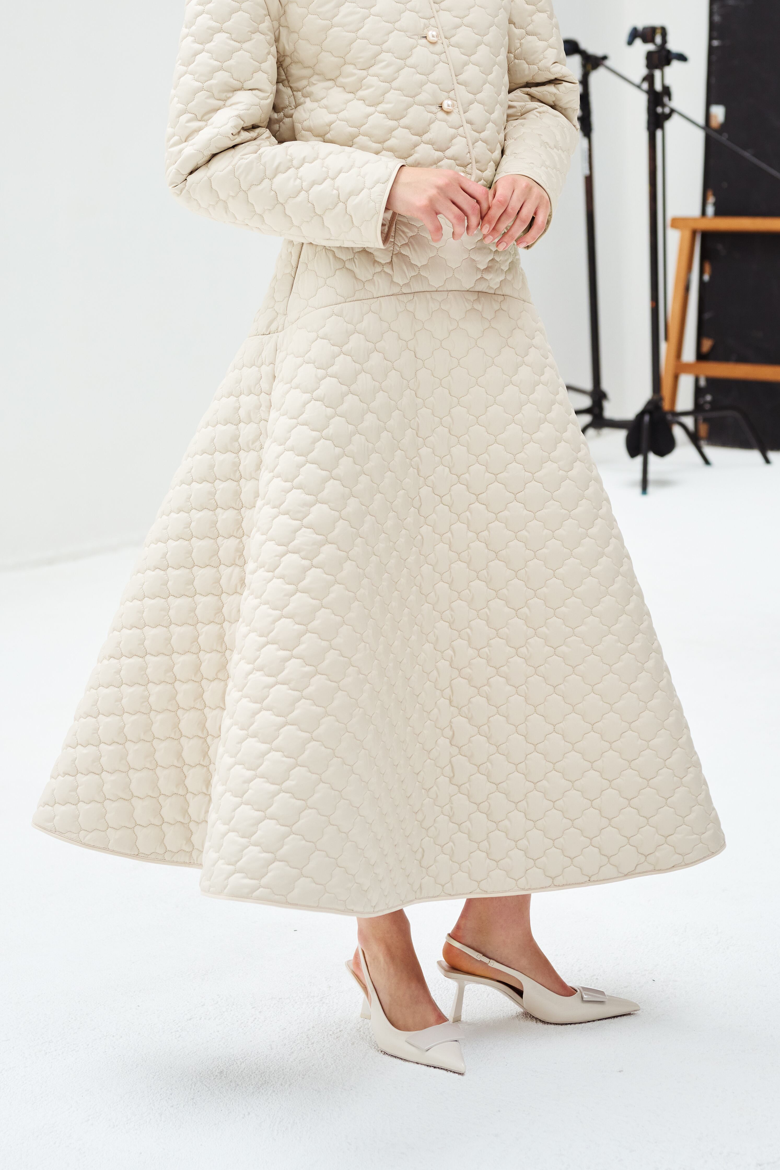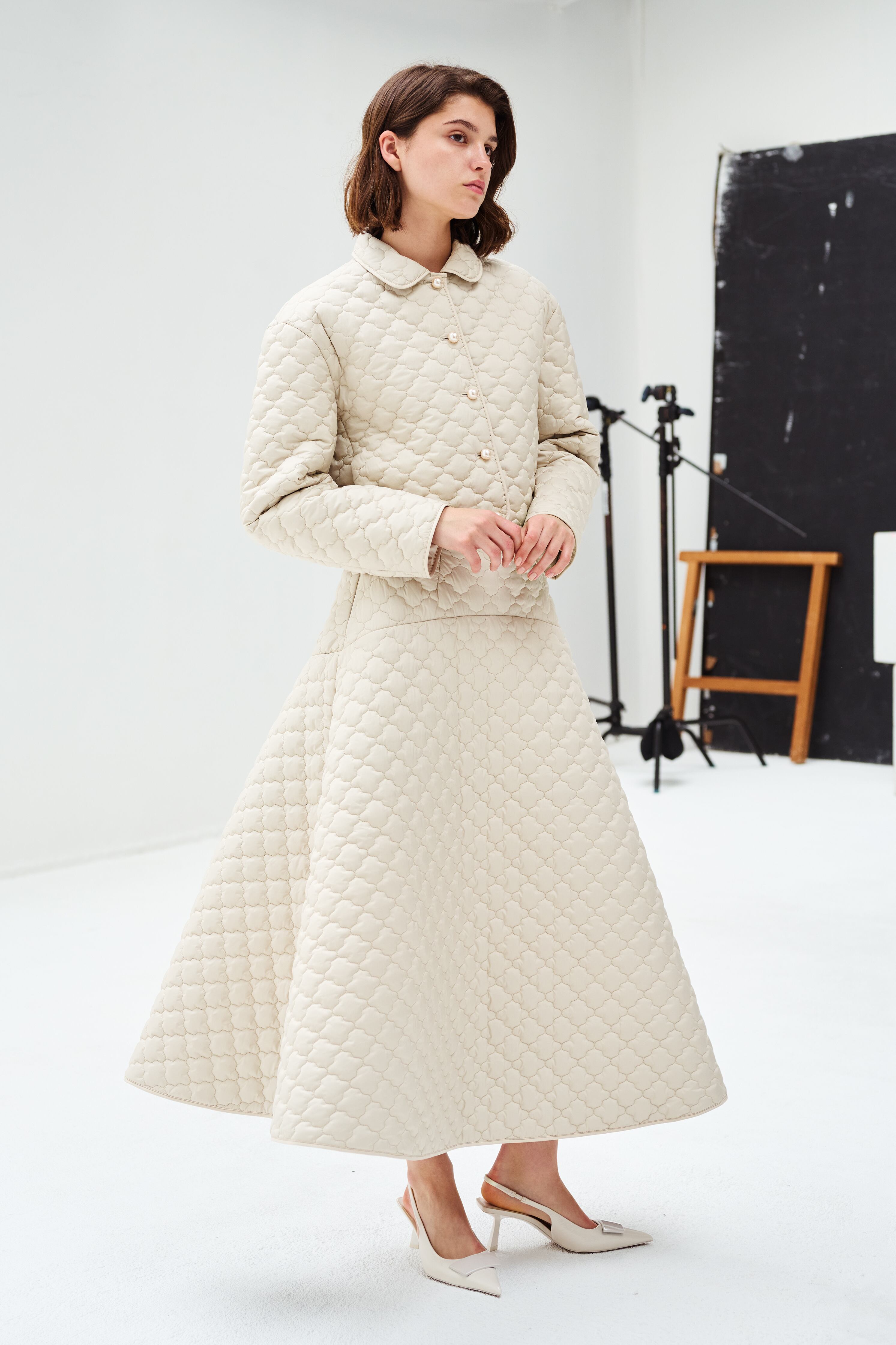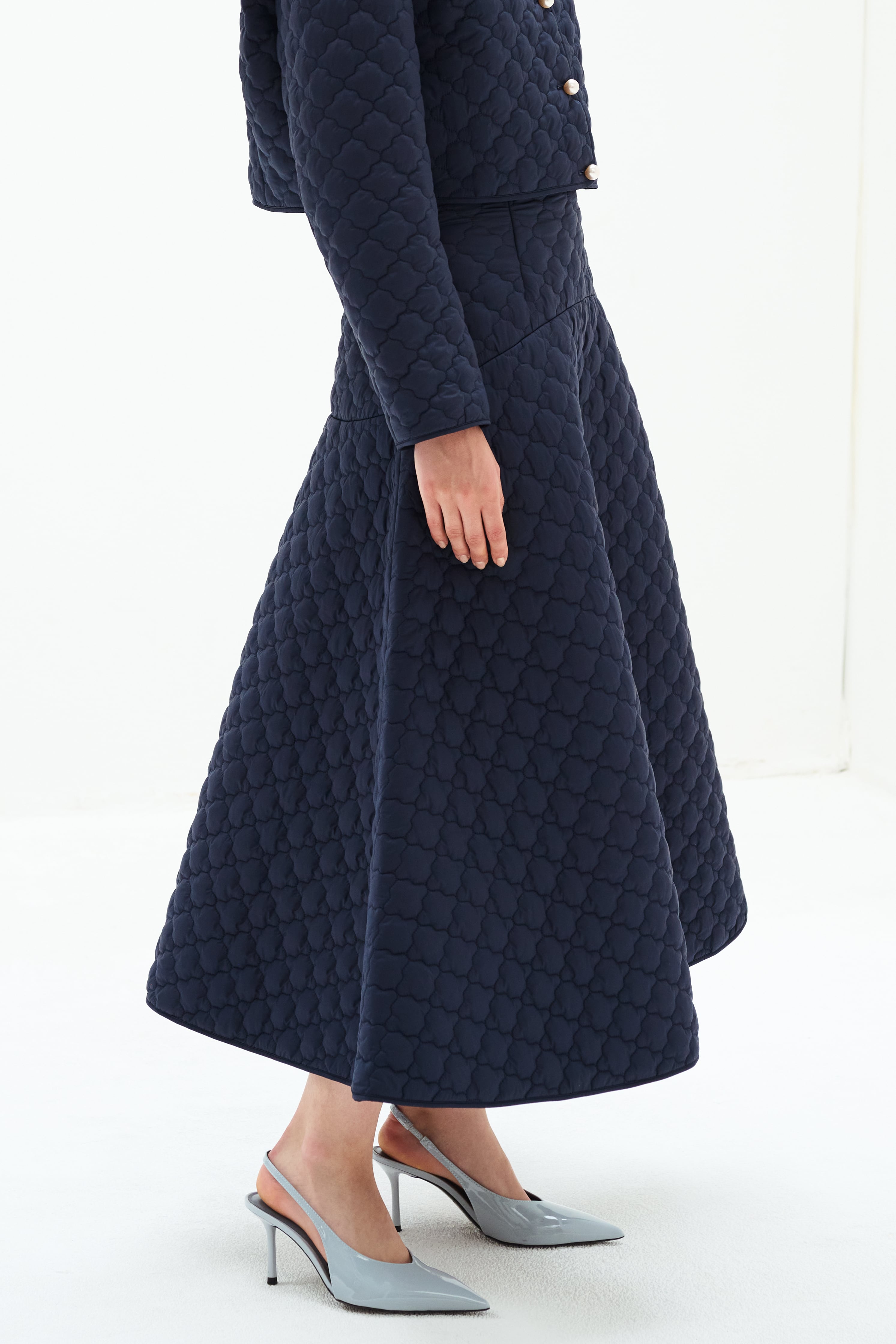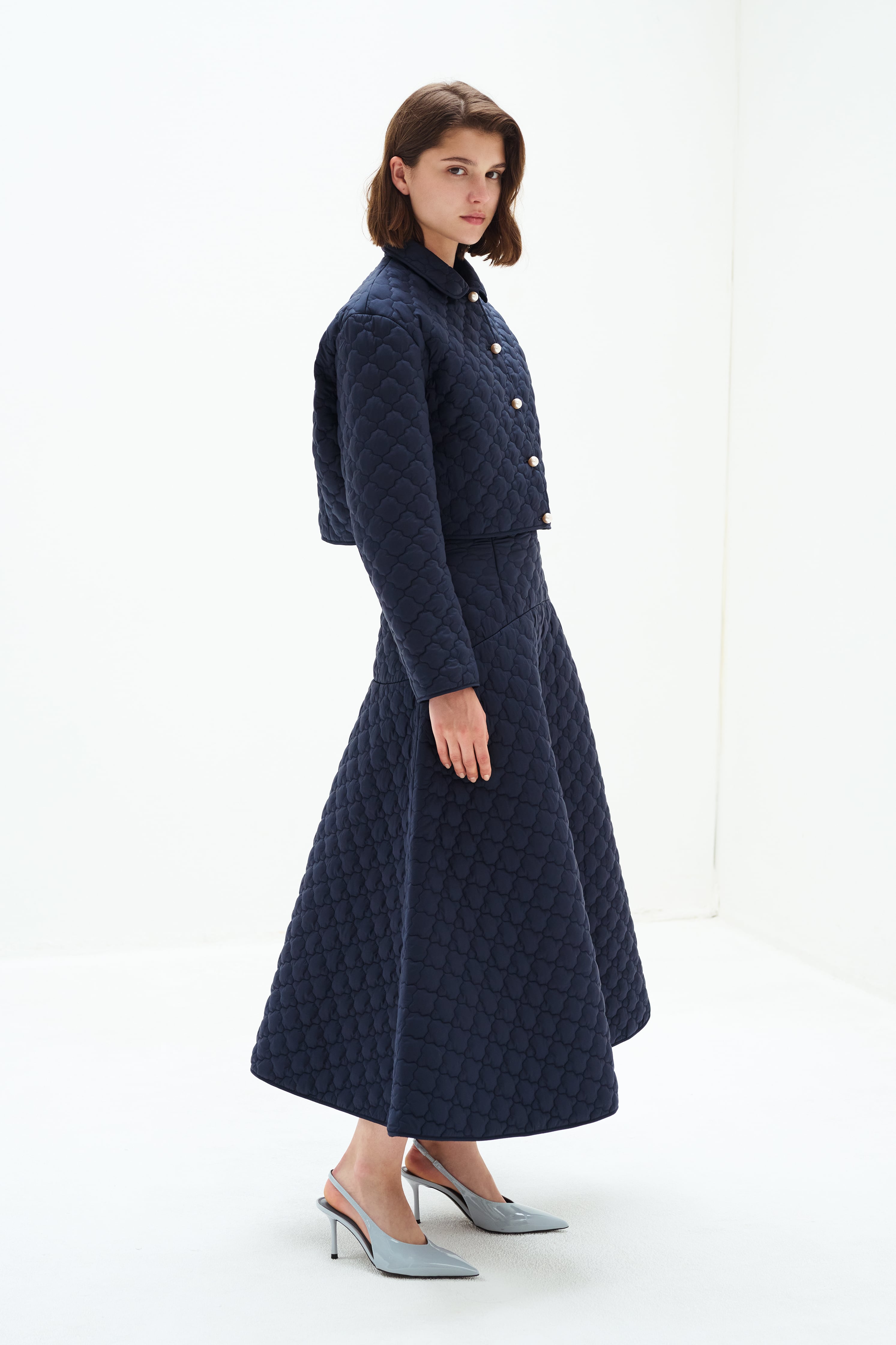 カジュアルに見えがちなキルティングを綺麗にお召しいただけるよう、繊細できめ細かい生地を厳選。丈感は長めに設定、ヒップ周りをすっきりし、大人なフレアーシルエットに広がるようにパターンを拘っております。
