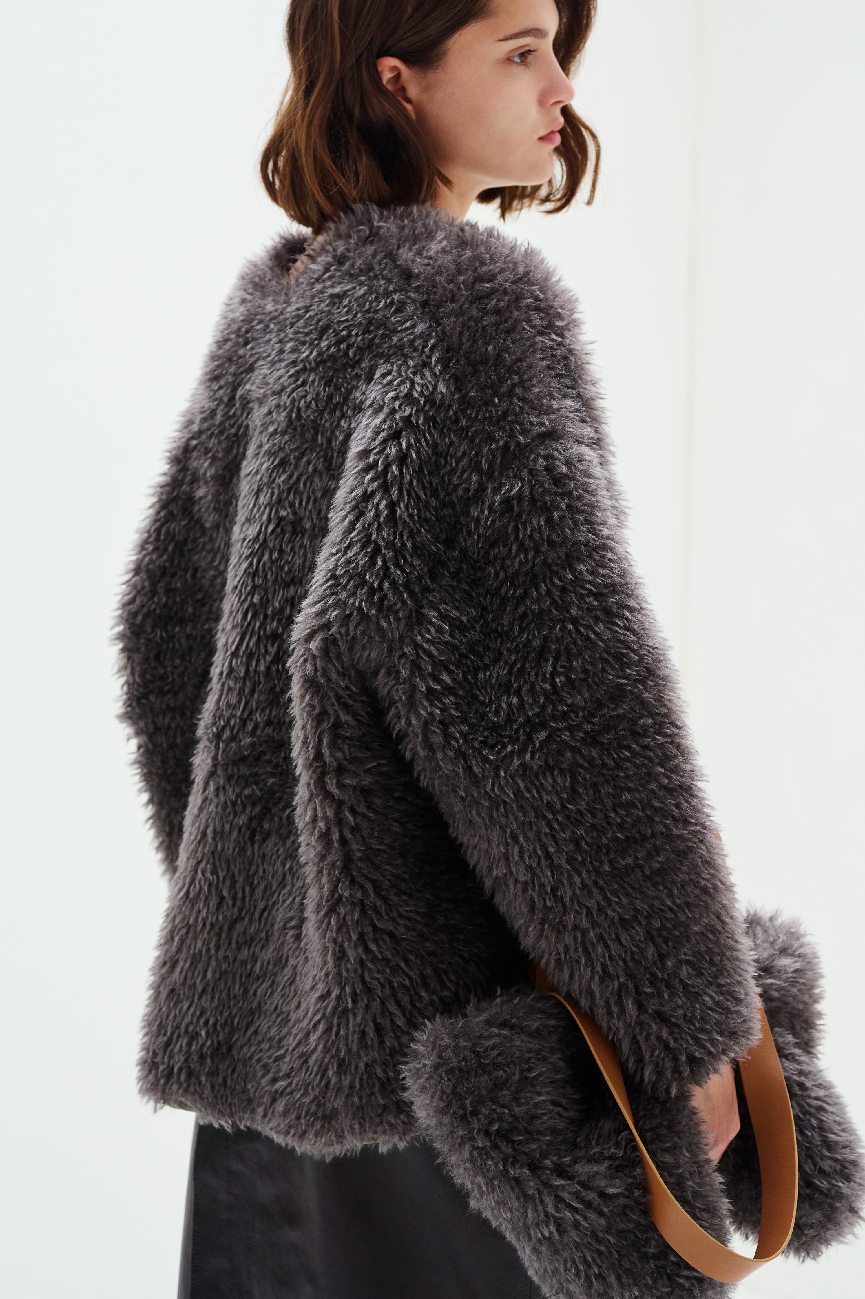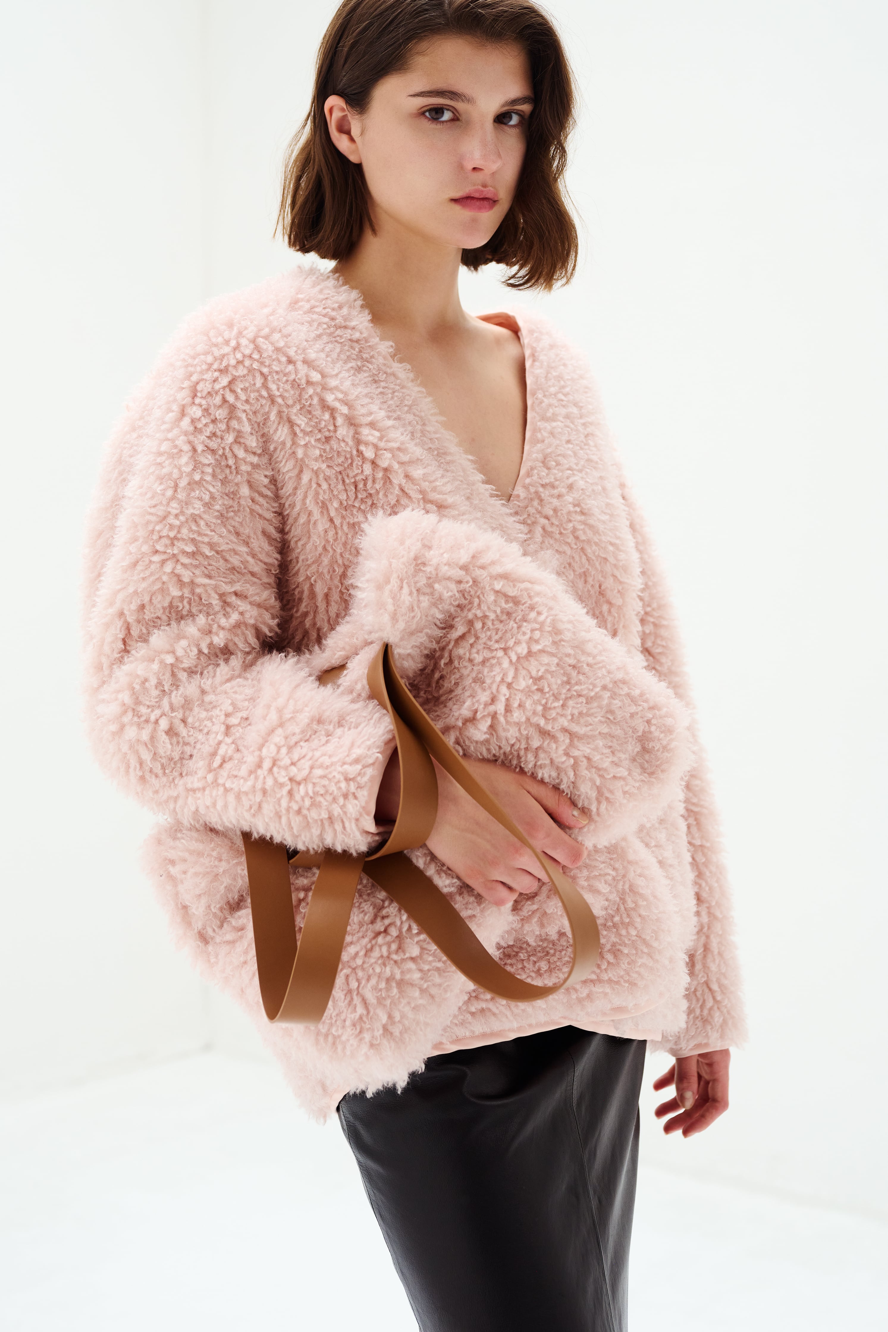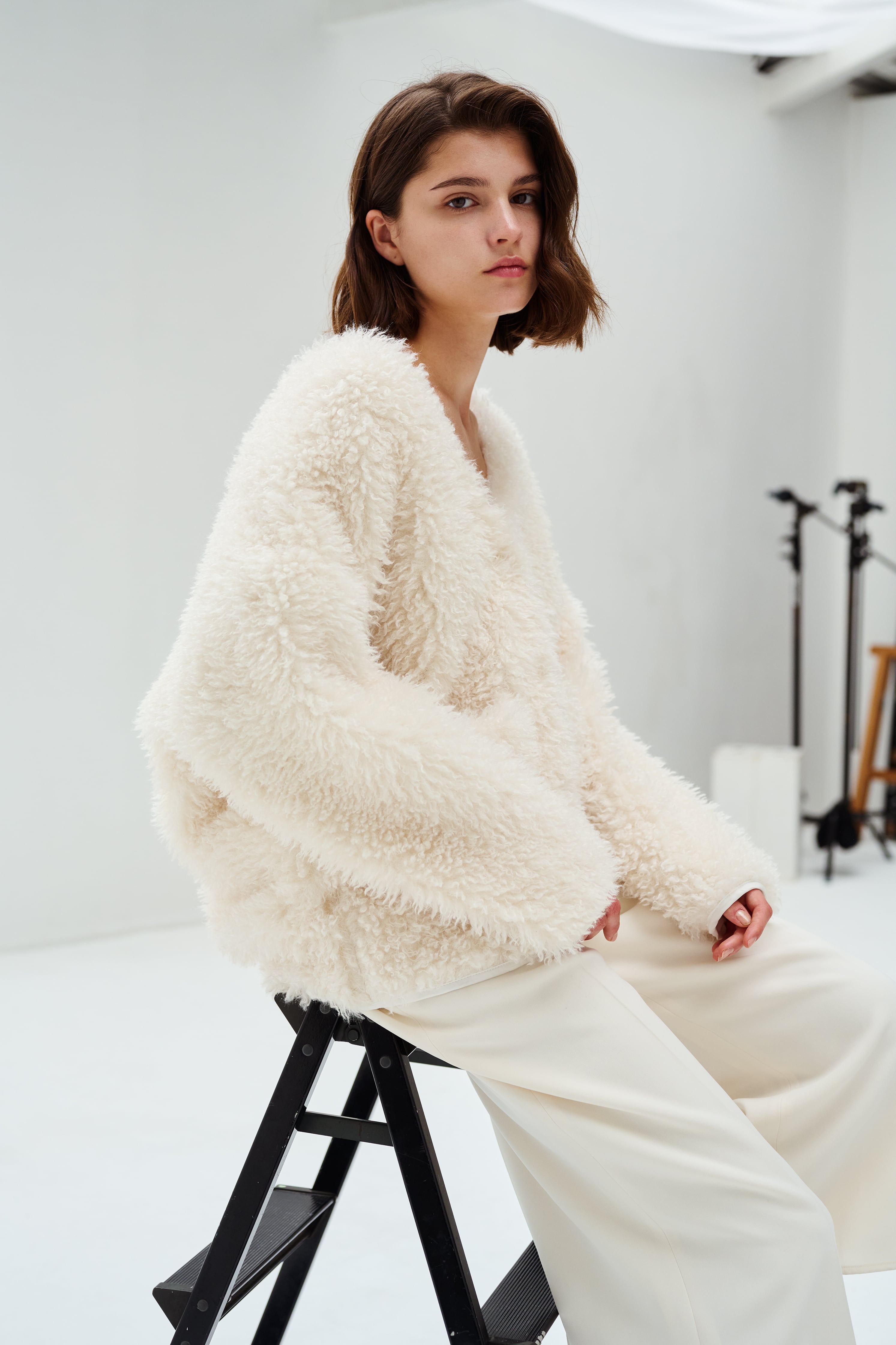 ニットで編まれたショートカーリーファーはしなやかな伸縮性で包み込むような着心地、冬の寒い日に思わず手に取りたくなる暖かさと軽い着心地。保温性を高めるため、伸縮性があるストレッチサテンの裏地を厳選。