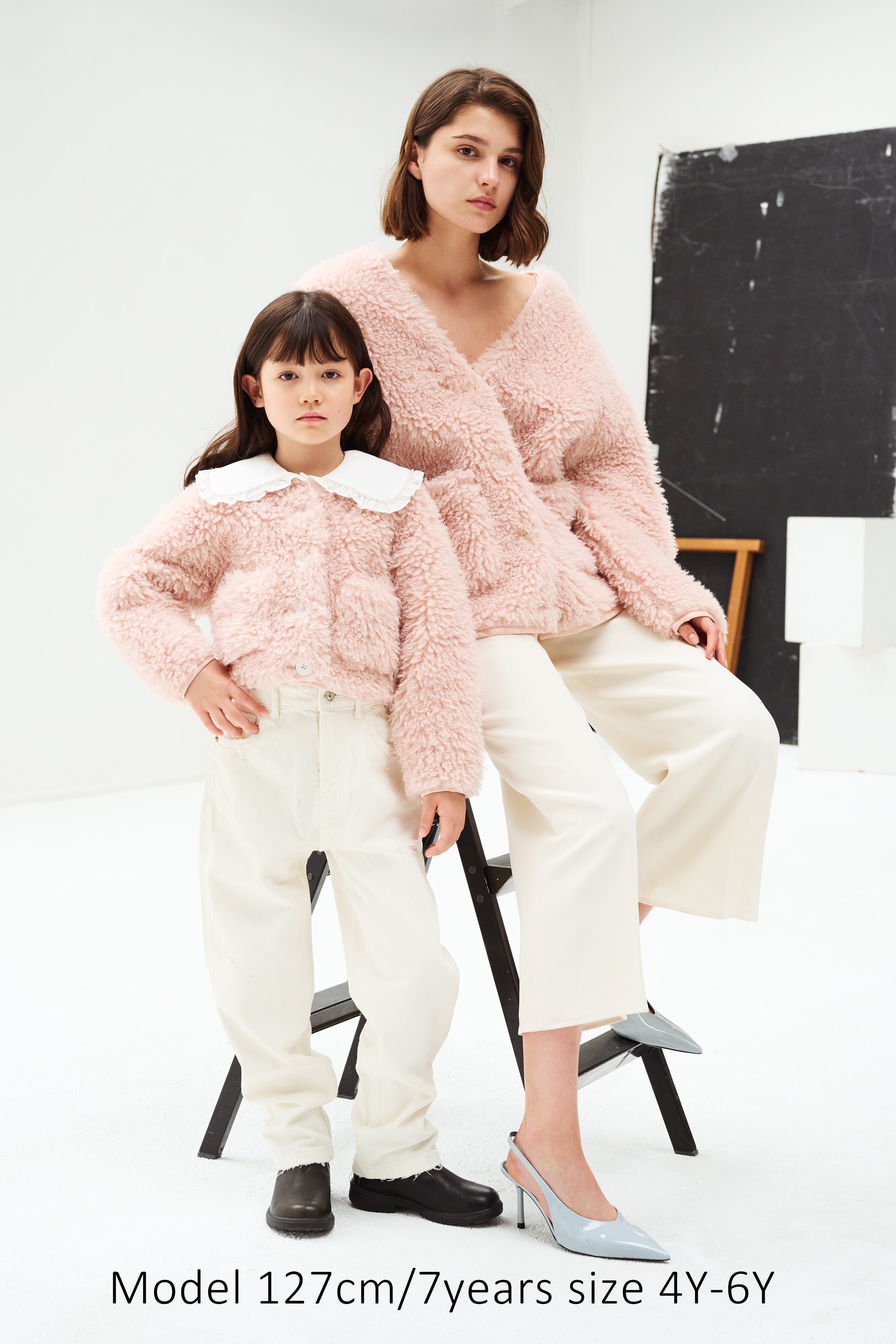 ノーカラースタイリングを選ばず、首回りが敏感なキッズにも嬉しい仕様。襟ありブラウスやスッキリしたニットにも相性がよいです。子供達の自分でできるという気持ちを尊重して、キッズは大きめの上品な貝ボタンをあえて厳選。