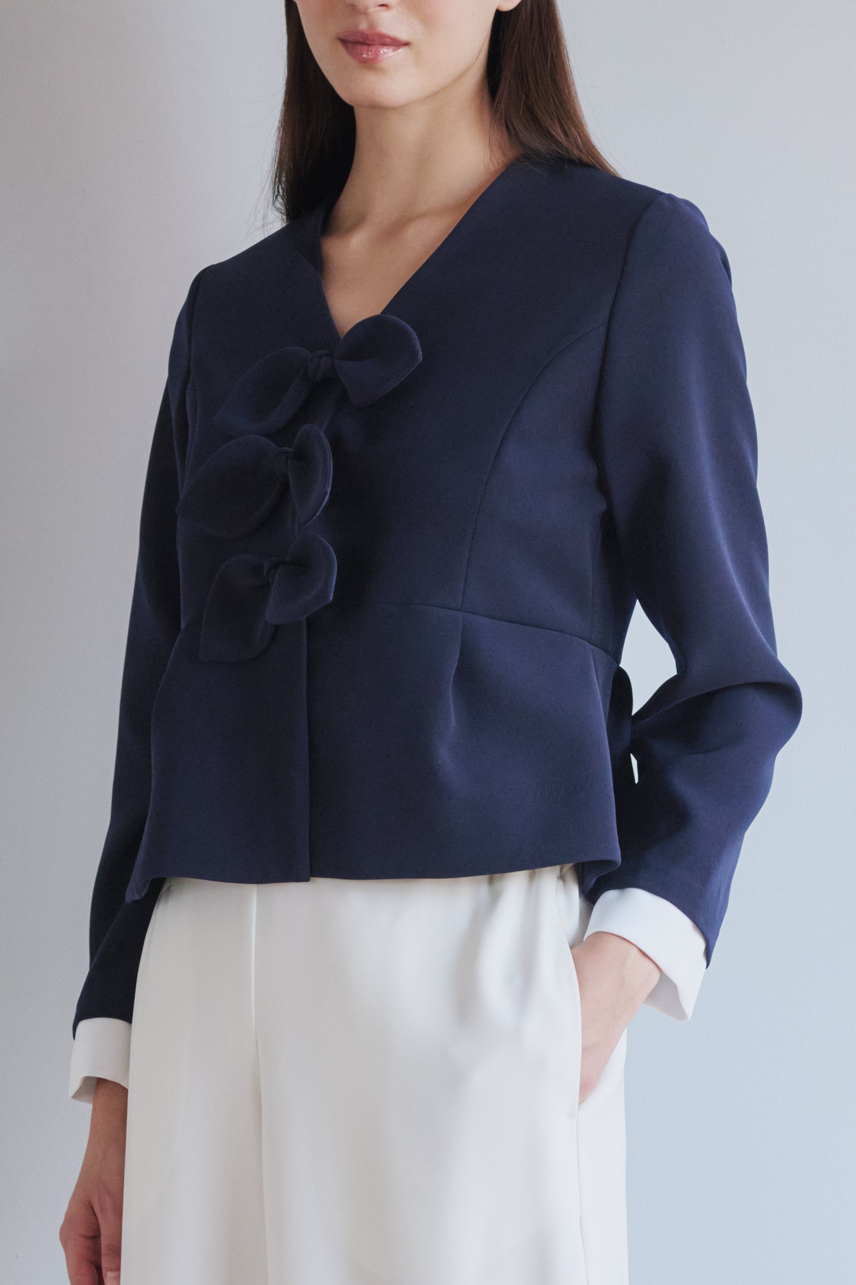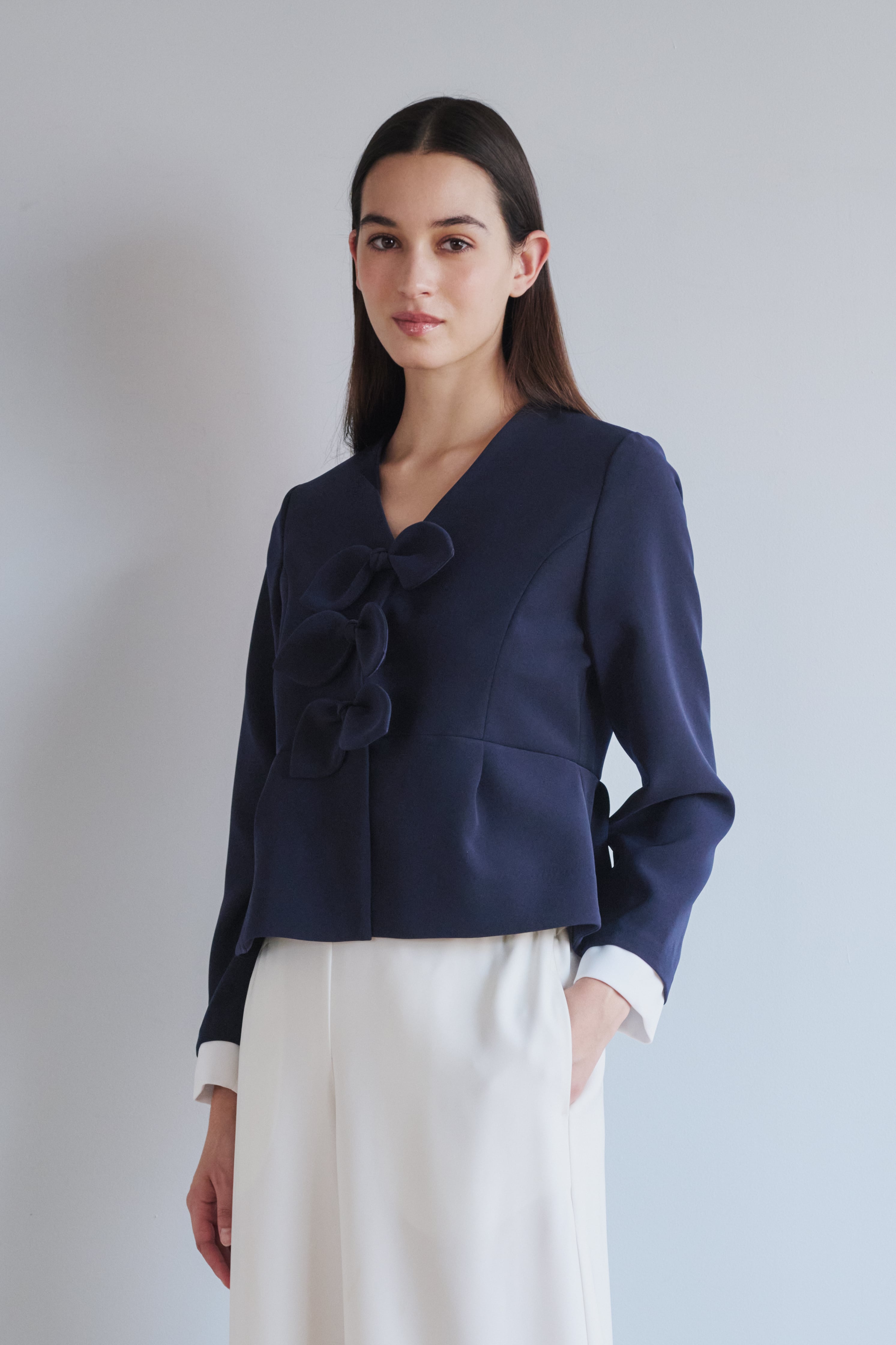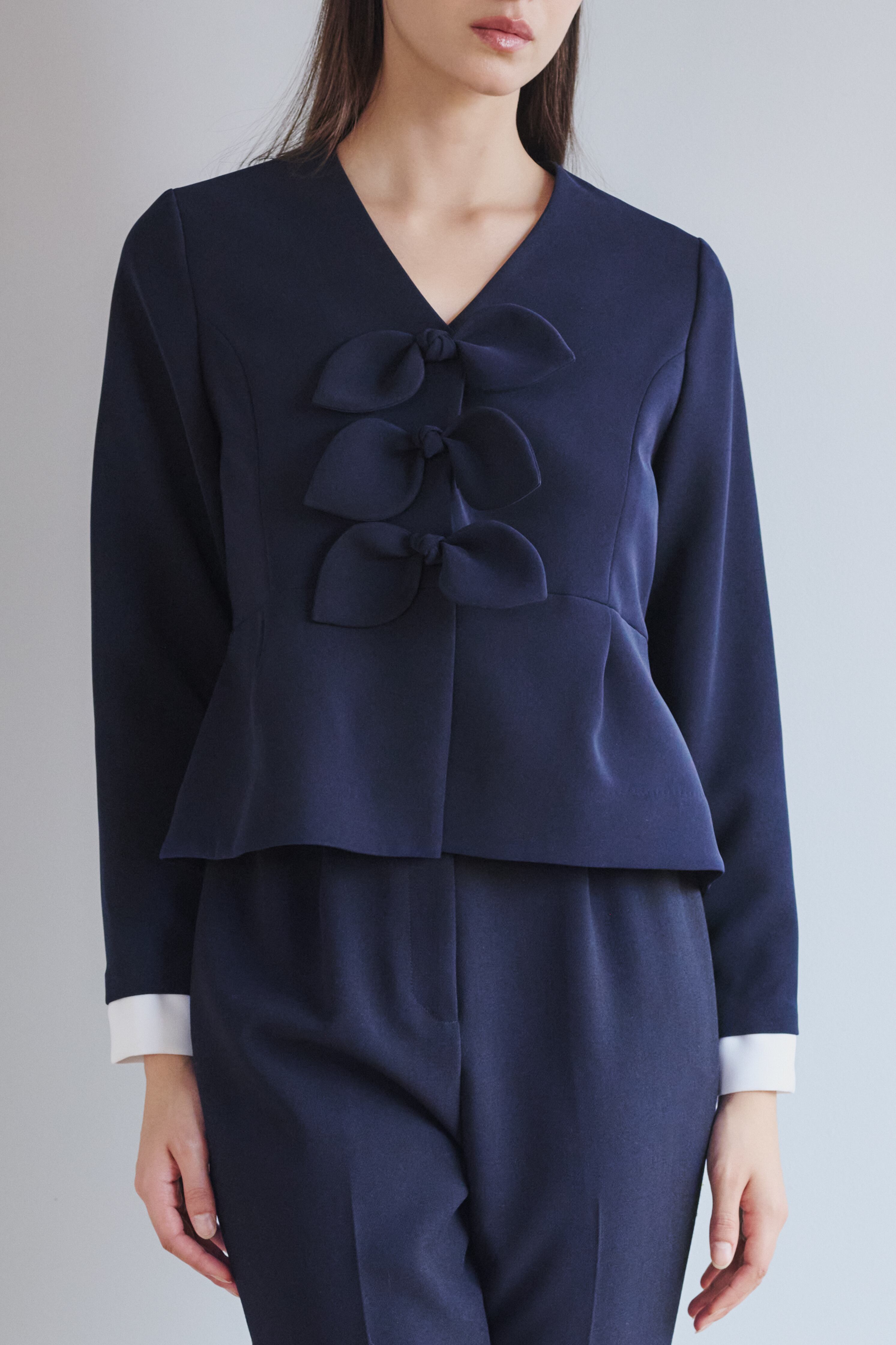 ホワイトのカフスが爽やかに演出。リボンは飾りディテールで比翼ボタンあきです。