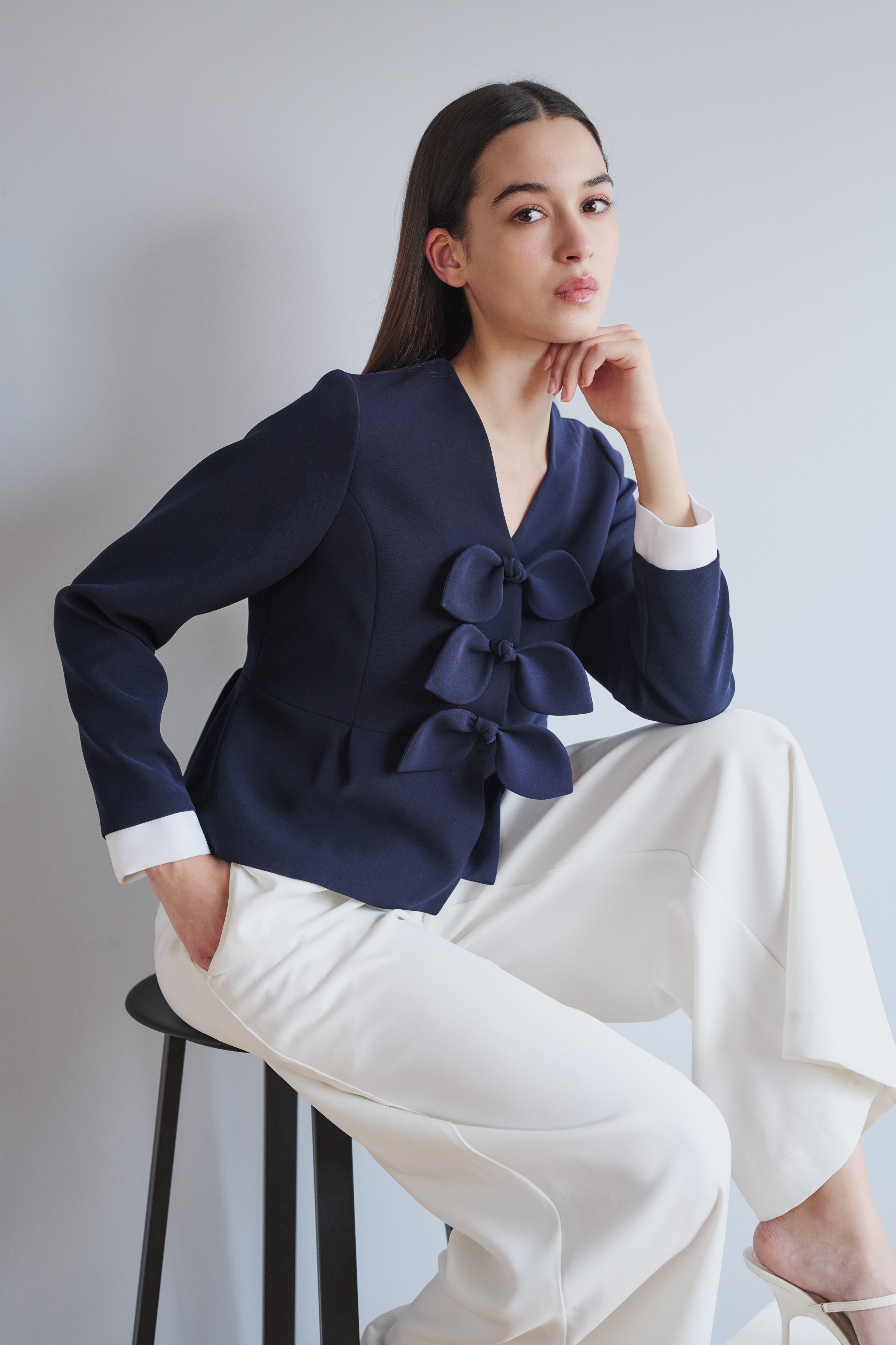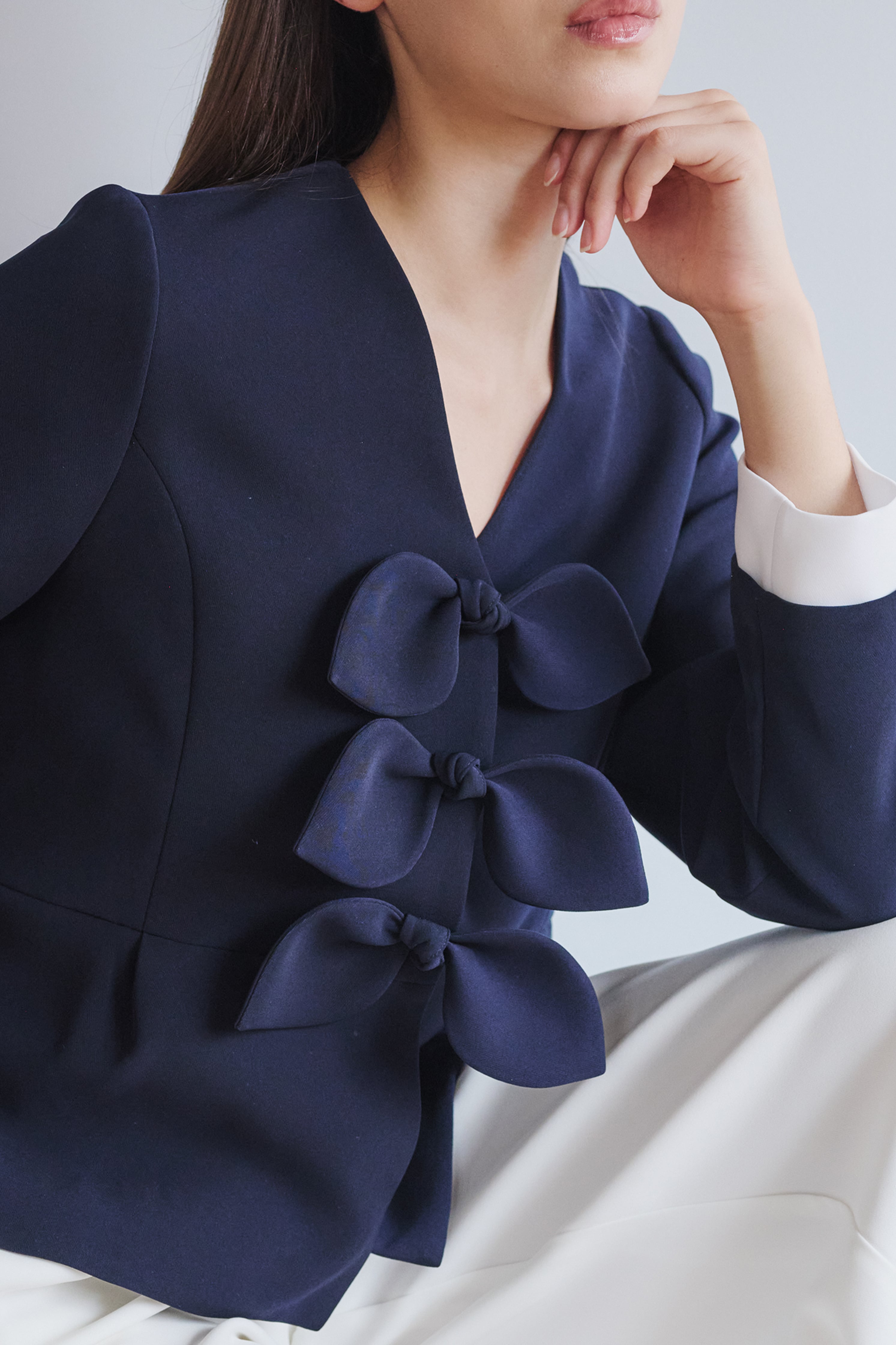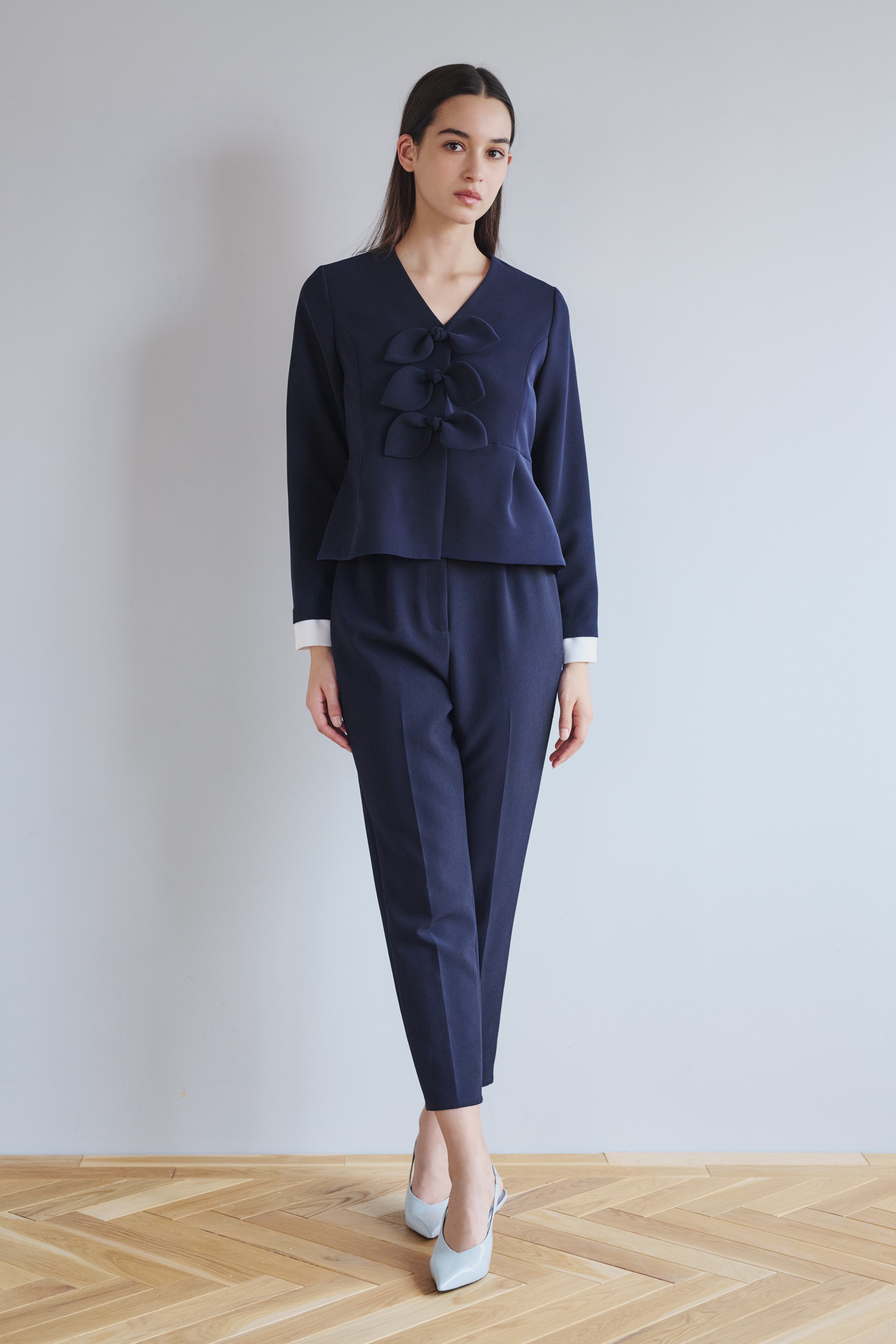ホワイトのカフスが爽やかに演出。リボンは飾りディテールで比翼ボタンあきです。