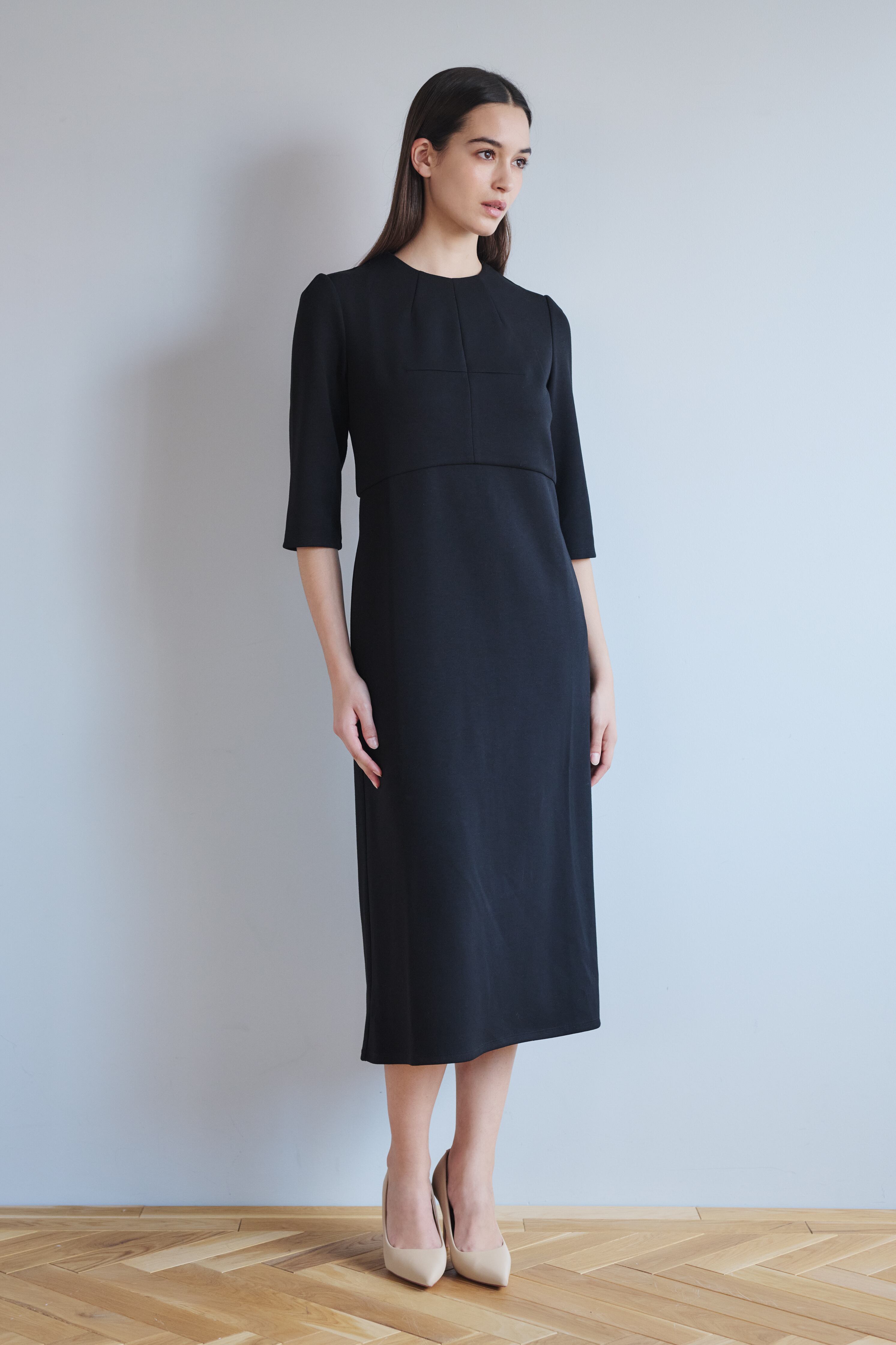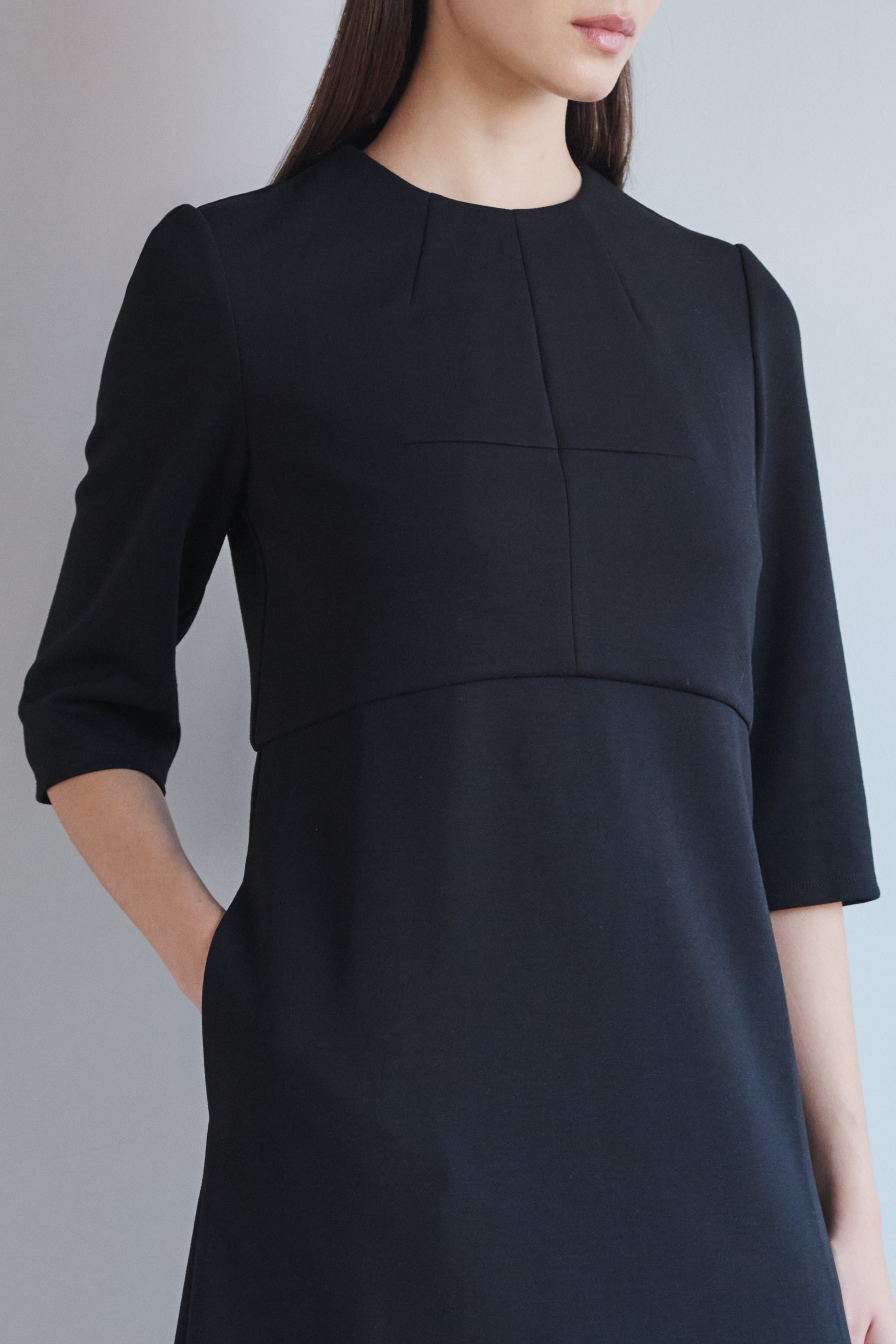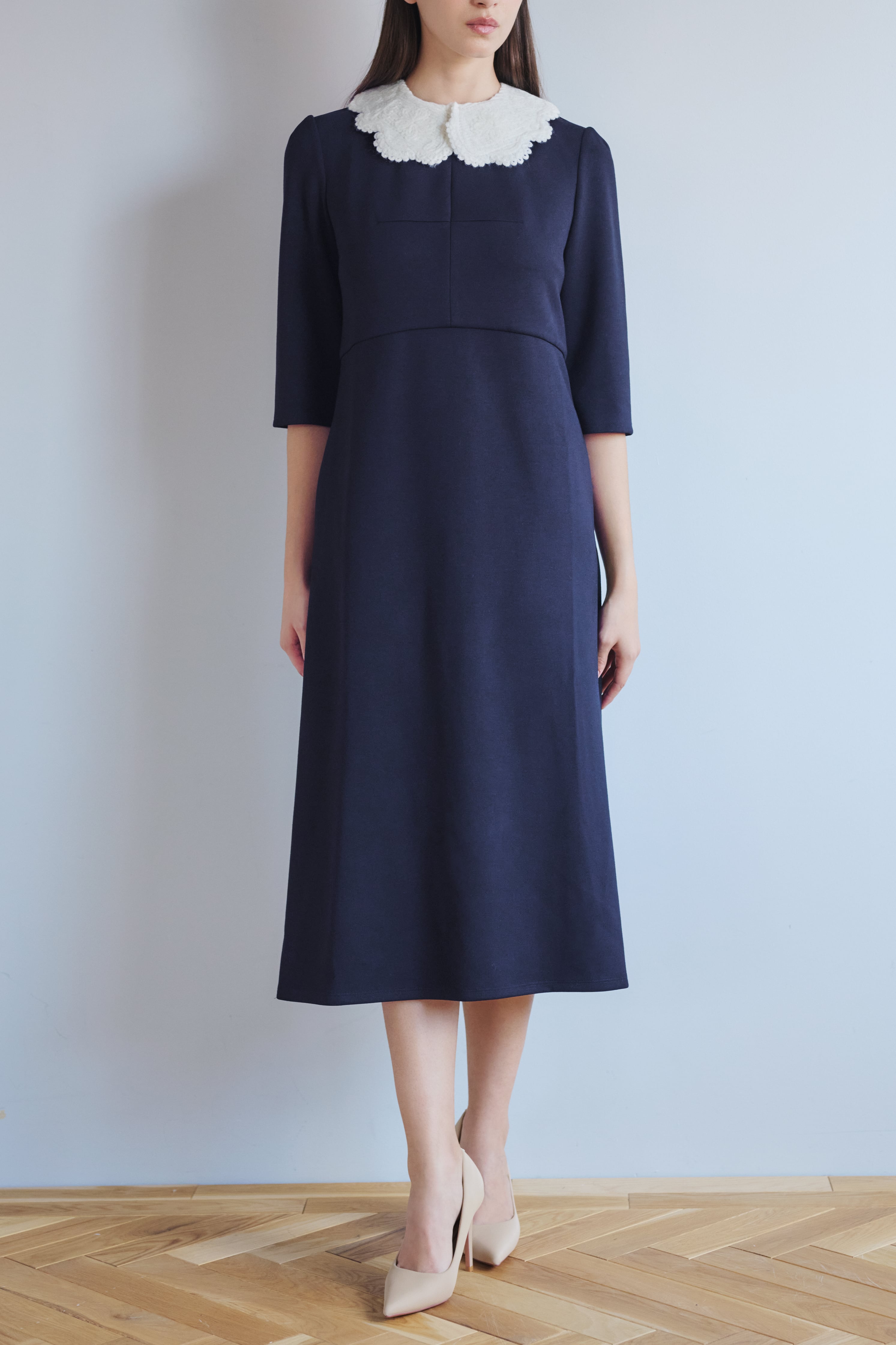 オケージョンシーンにモード感とリラックス感をテーマに生地とシルエットにこだわりました。きちんとしたい場面でも着疲れることなく、お召しいただけます。シンプルなカッティングを生かしたIラインワンピース。ソフトなスポンディングのジャージ素材でほどよいゆとり感が着心地良く、一日中綺麗な印象を崩れません。*襟は別売り