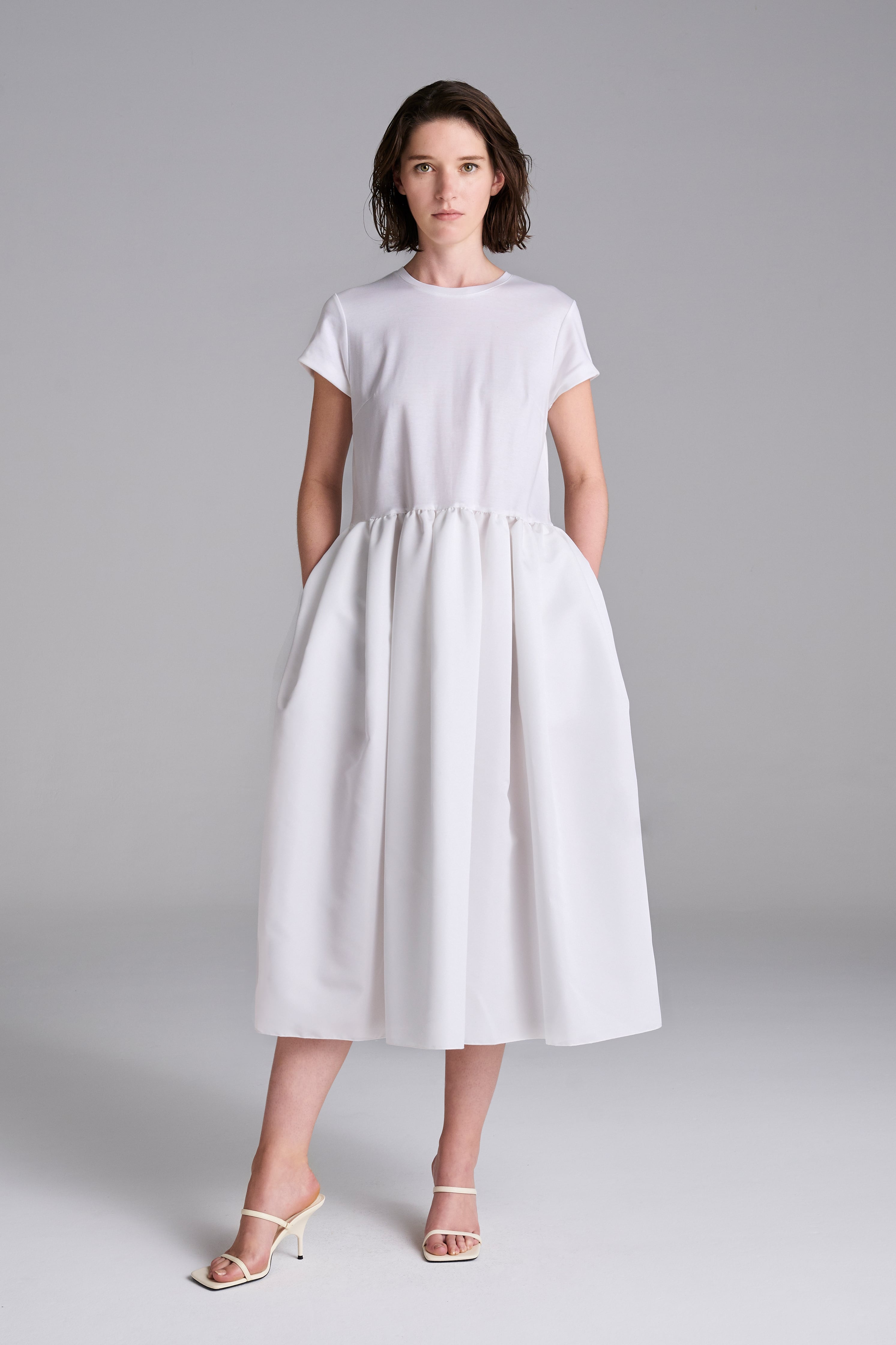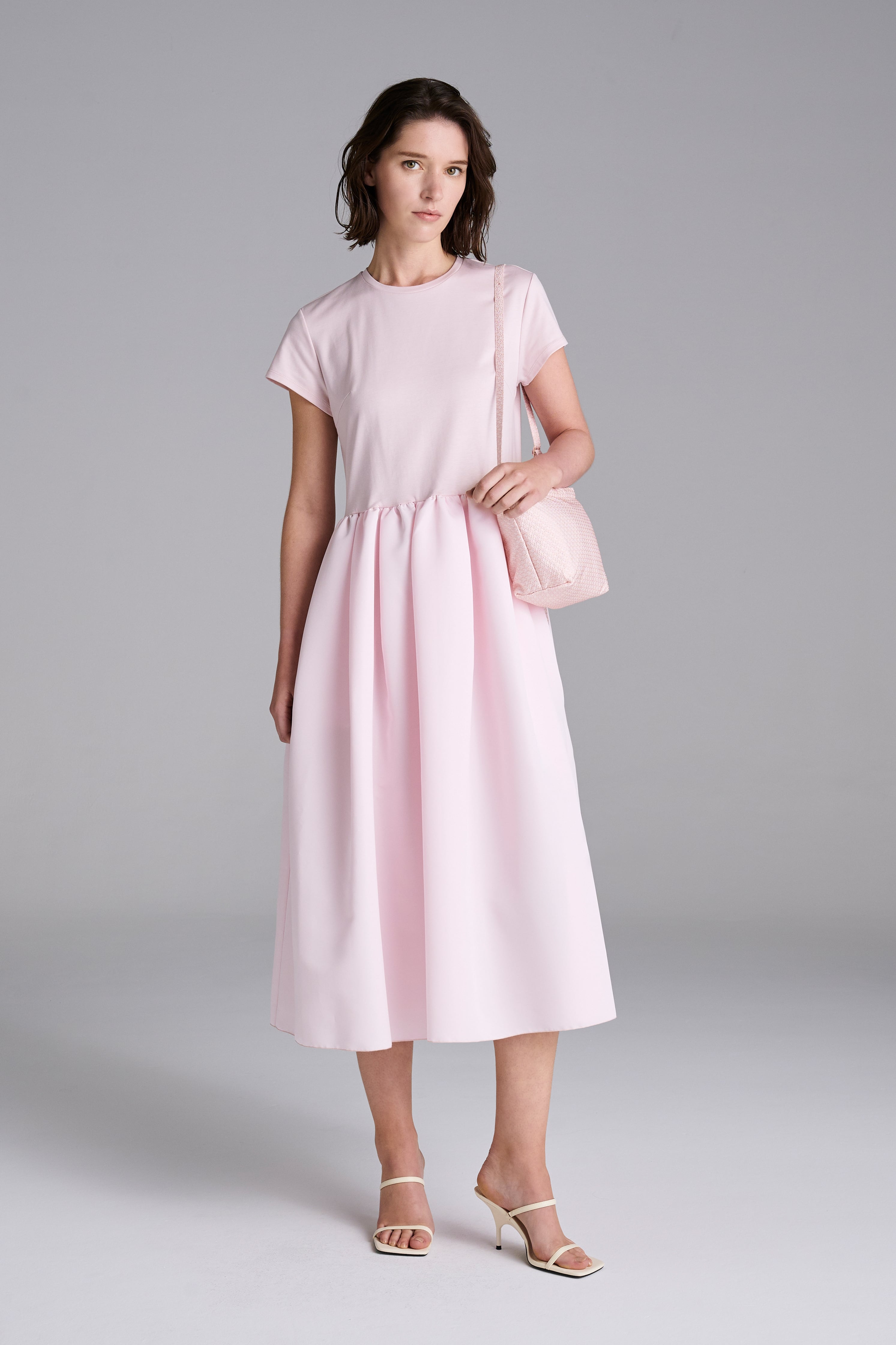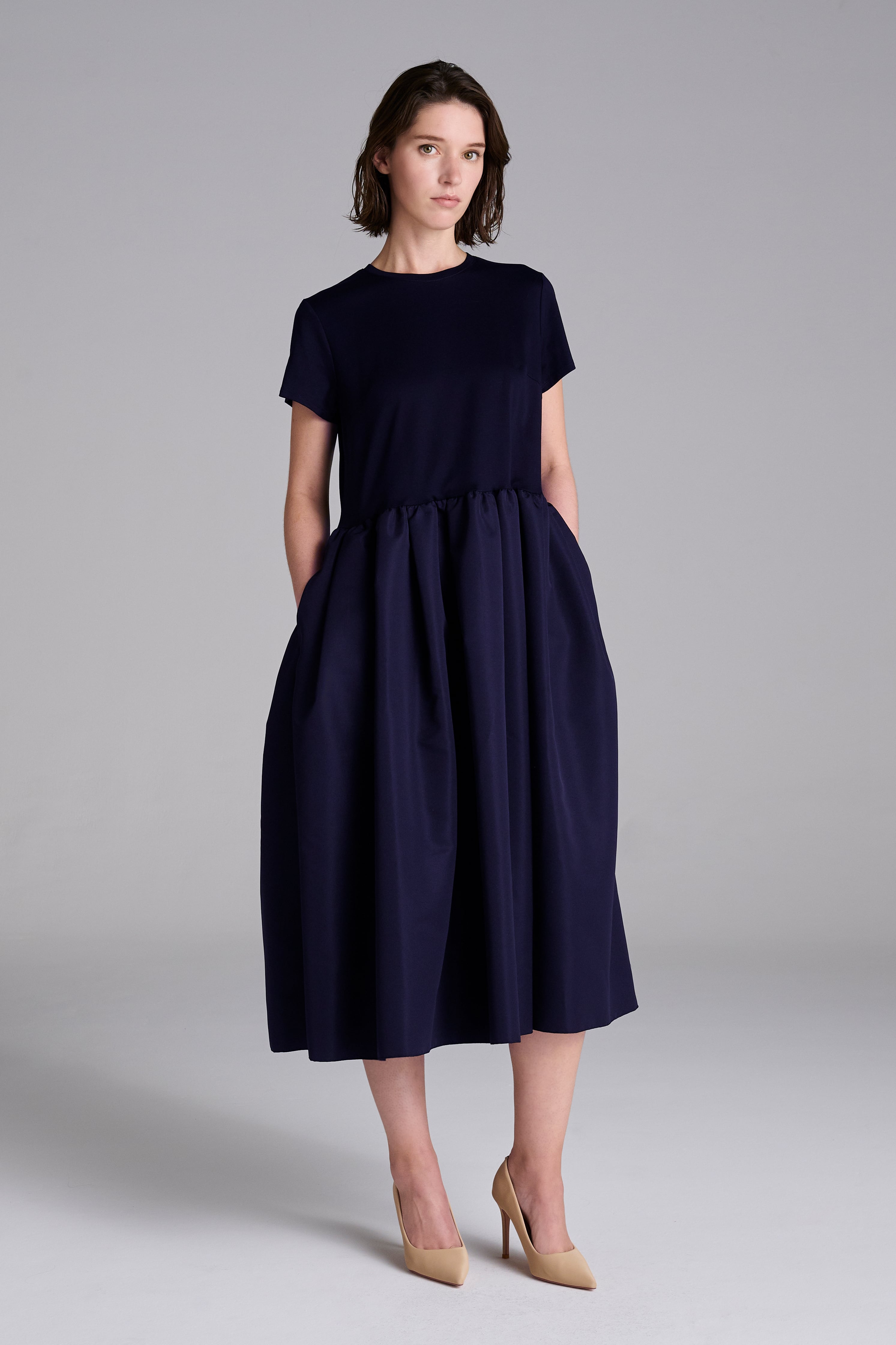 身頃は透けにくいジャージー、スカートはサテンのような光沢感のあるグログラン素材を使用。ワンカラーながら存在感のある着こなしに。