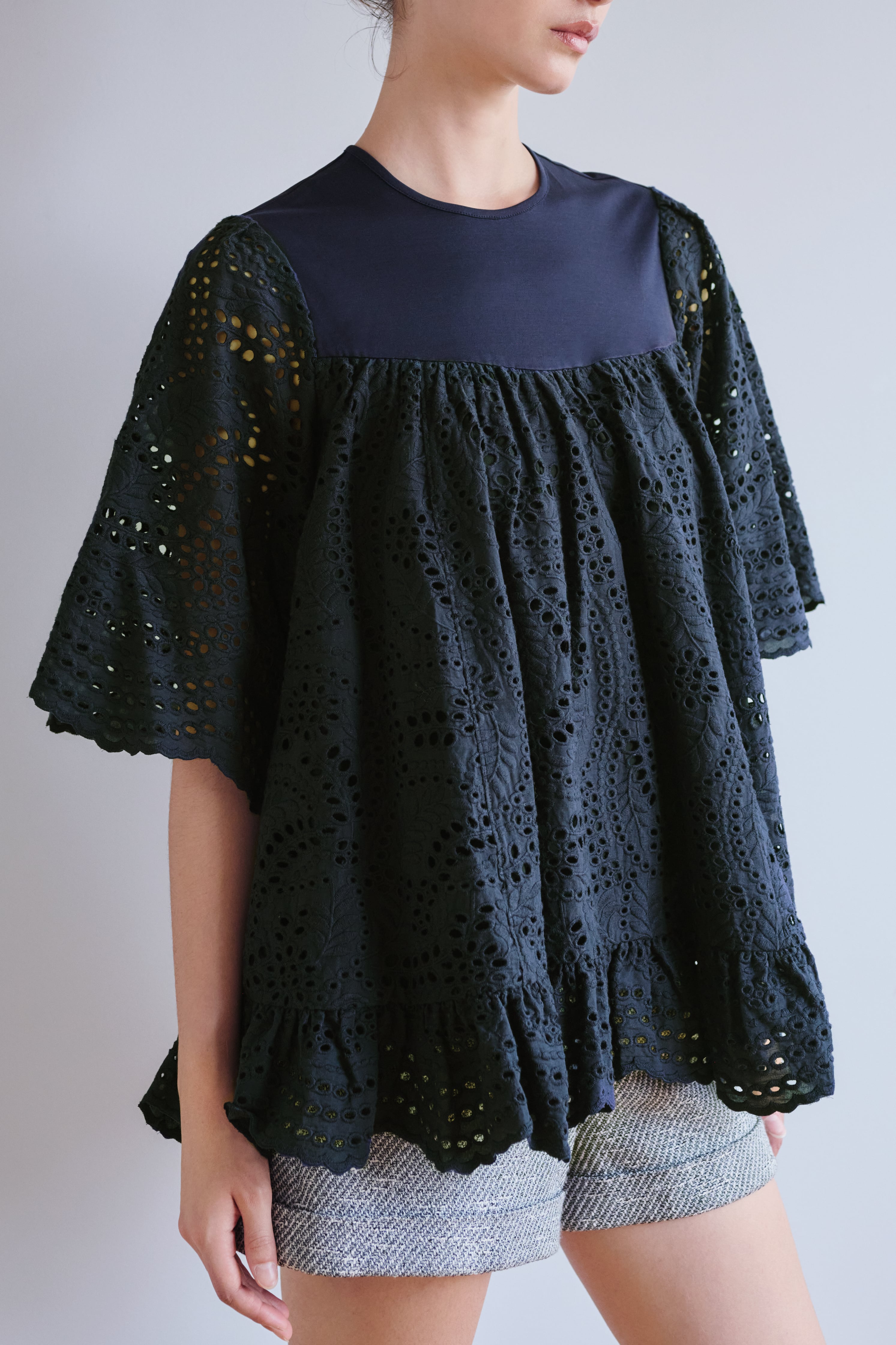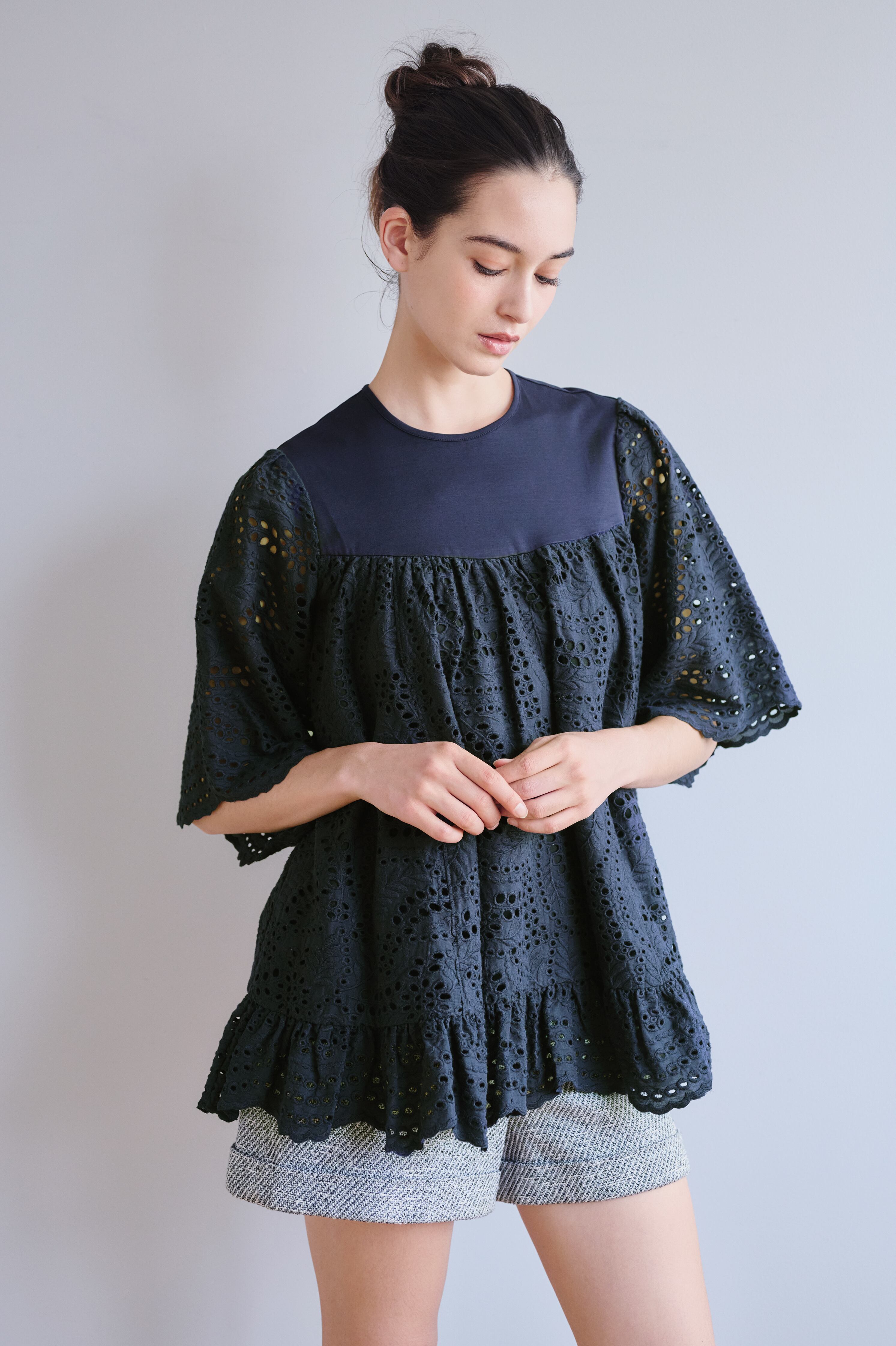 身頃はジャージ、袖は風通しがよいレース1枚、身頃は裏地がついております。"