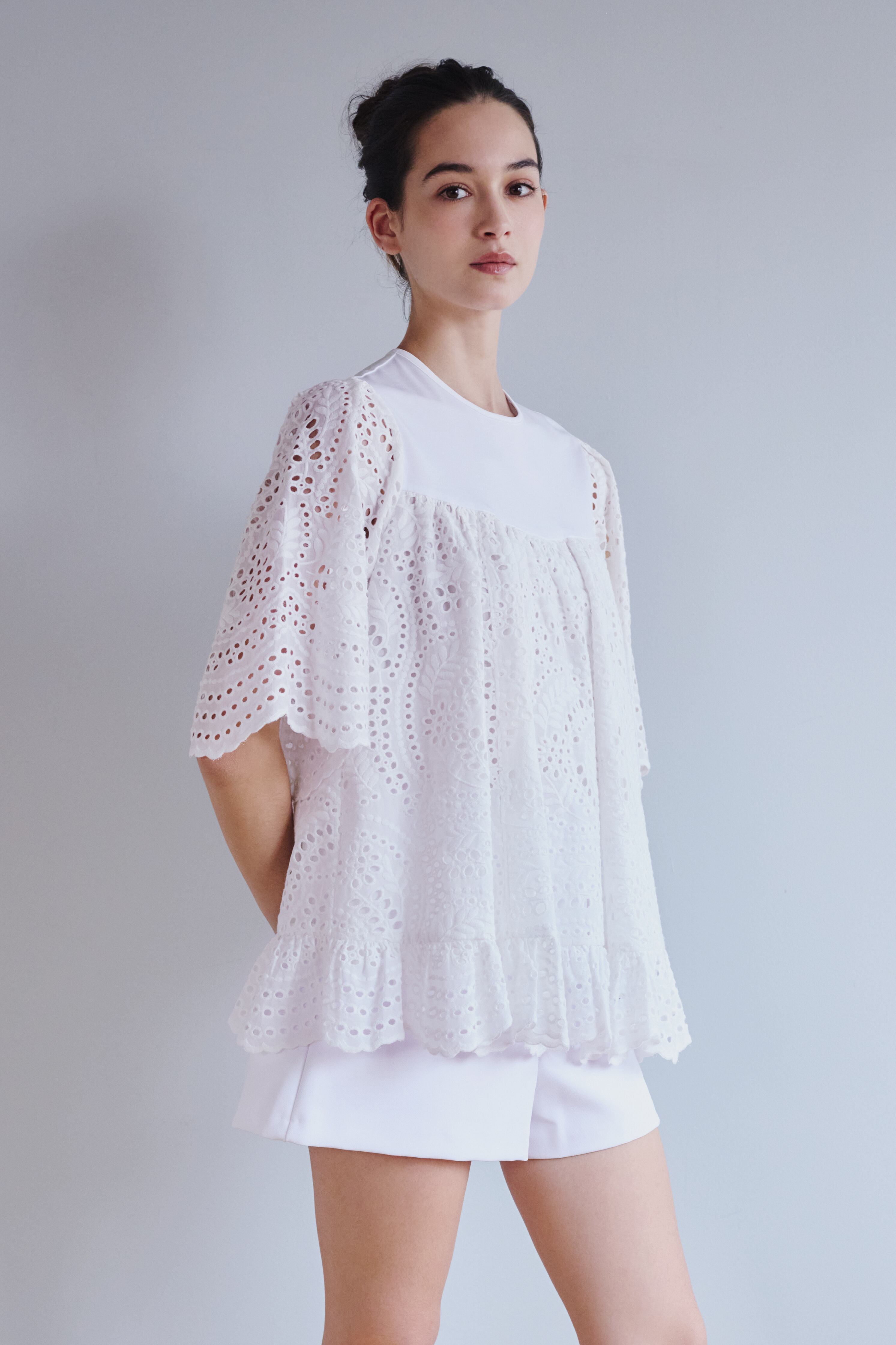 自然を感じるリーフ、海の泡、貝殻のスカラップがミックスした柄はコットン100%刺繍レースを使用。暑い夏が楽しくなる、風を感じるレース柄になっております。