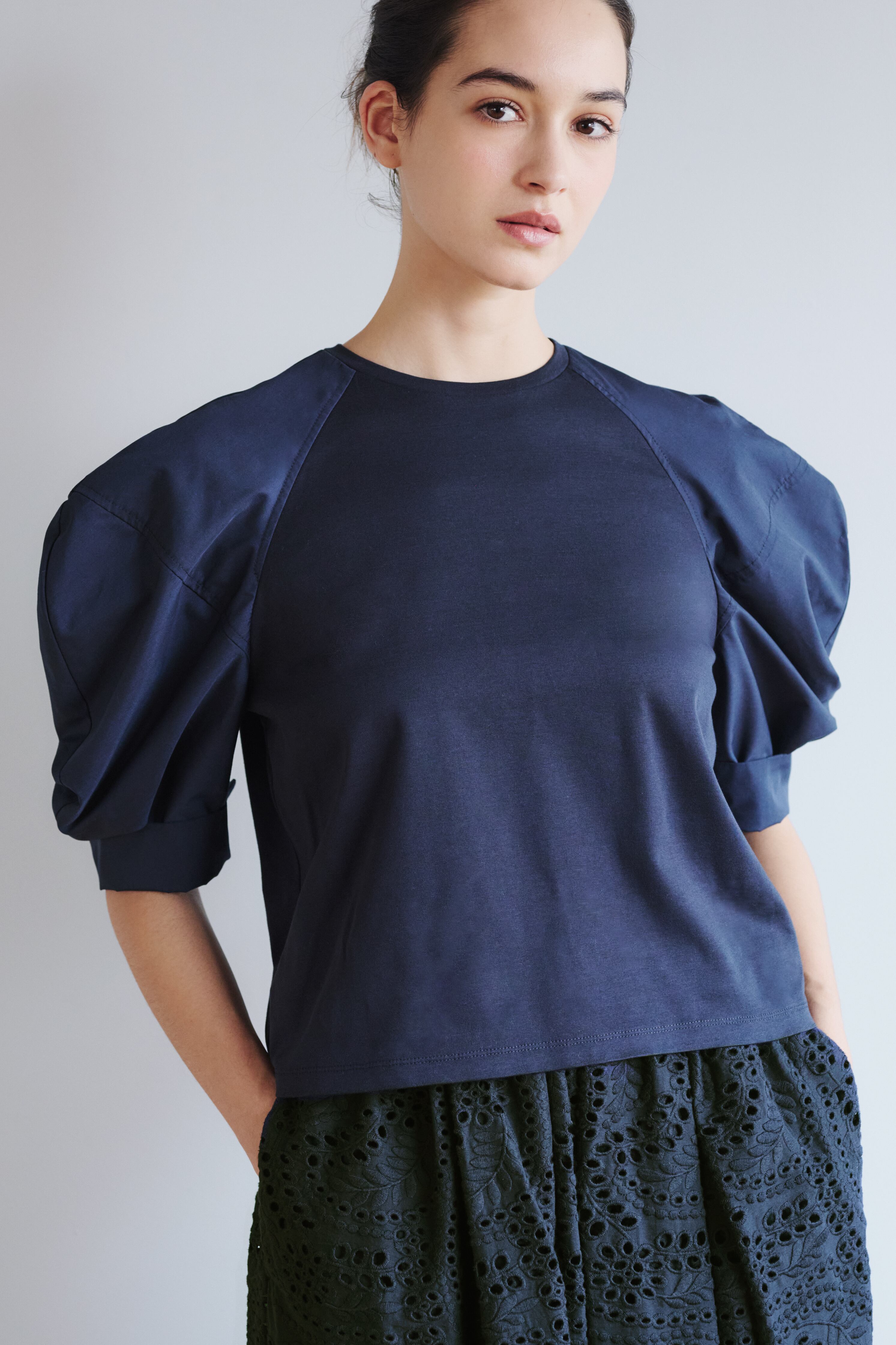 顔周りがスッキリ、華やかに仕上がるパフスリーブトップ。パフスリーブでも大きくなりすぎないようにパターンに仕上げました、どなたでも馴染むようにラグラン切替になっており、気温やスタイリングによって袖口は袖の長さを調整できるように、カフスになっております。
