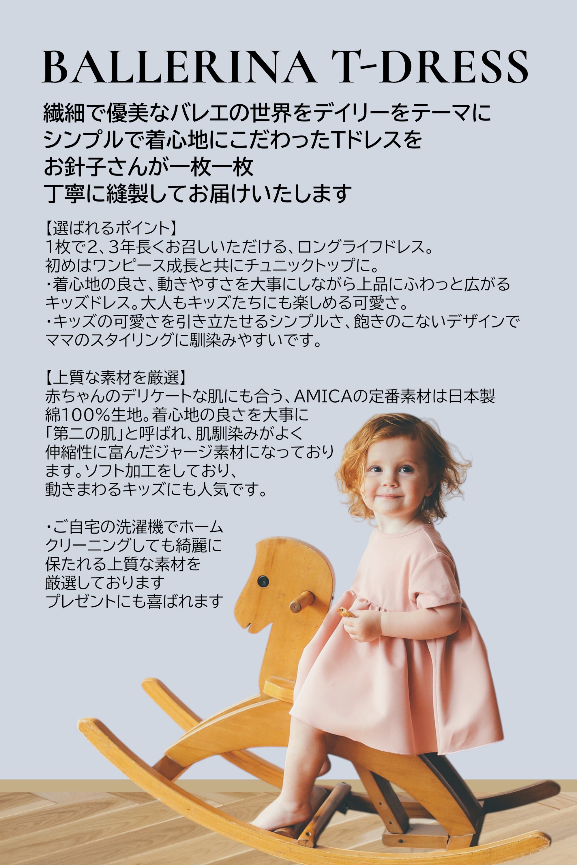 バレエの繊細で優美な世界感をデイリーにも着こなせるよう、モダンでミニマルなデザインに。はじめはワンピース、成長と共にチュニックになり3年ほどお召しいただけ、すぐにサイズアウトしてしまう心配がありません。