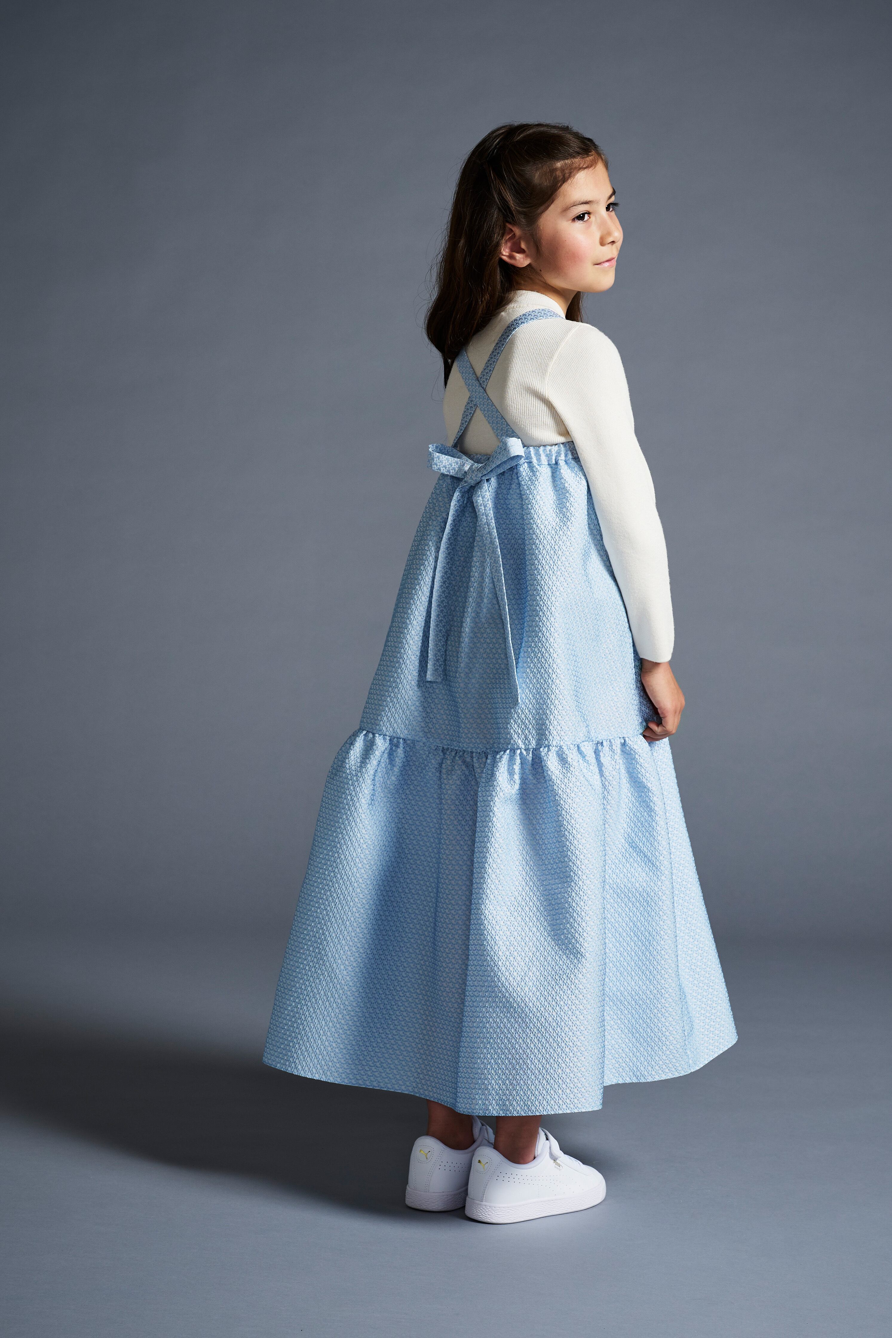 ジャガードはジプソフィル柄。無地のようなスタイリングのしやすい、小花柄ジャガードに。繊細な光沢感があり、甘くなりすぎないドライタッチのハリ感はモード感がありながらシックな印象に。シルエットは定番のクリノリンスカートを用いており、今季は7cm長くなりなりました。