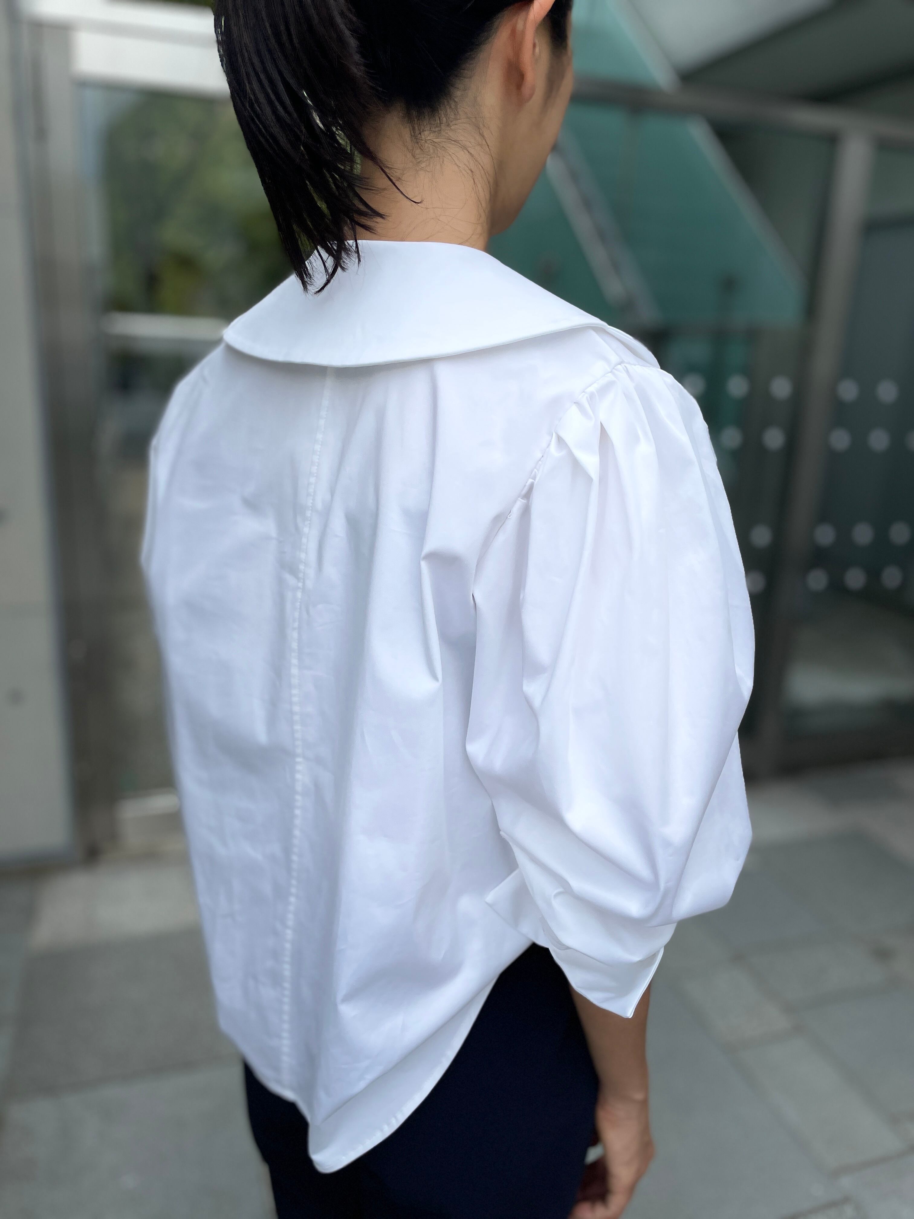 上質なストレッチ・コットンサテンを厳選。タキシードシャツのディテールをスカラップにクラシカルな華やかさで演出。インしてもアウトにしても一枚で様になります。