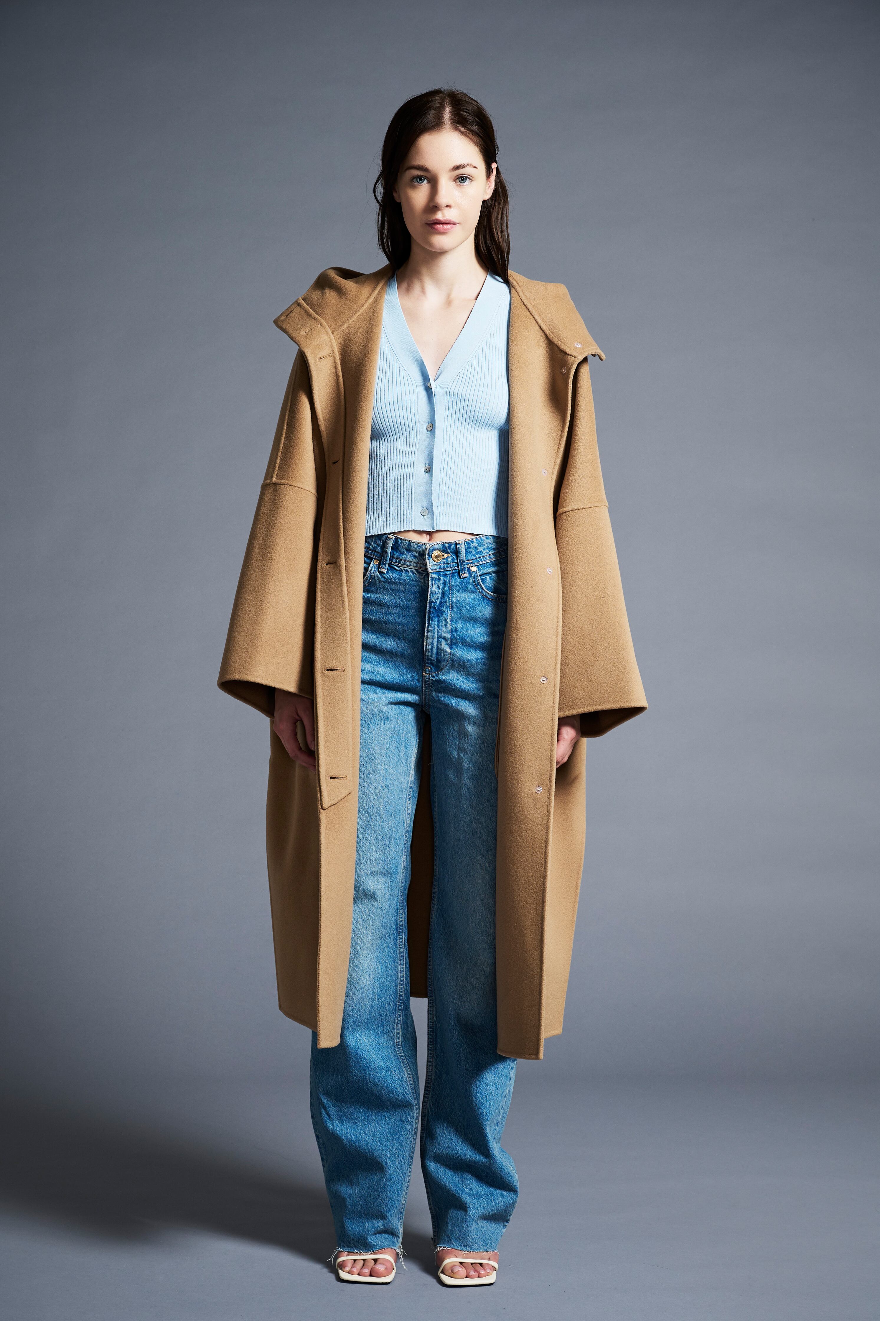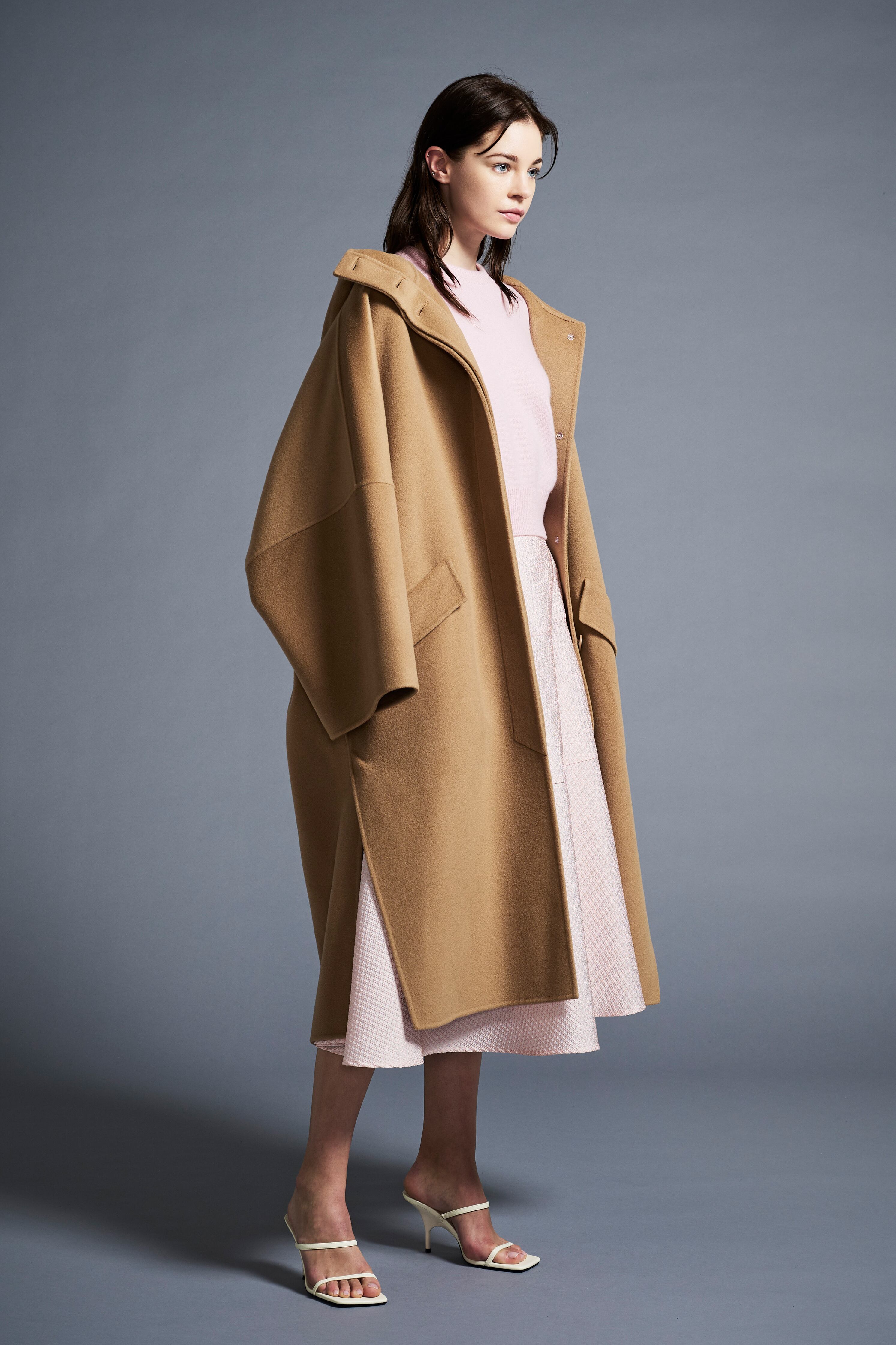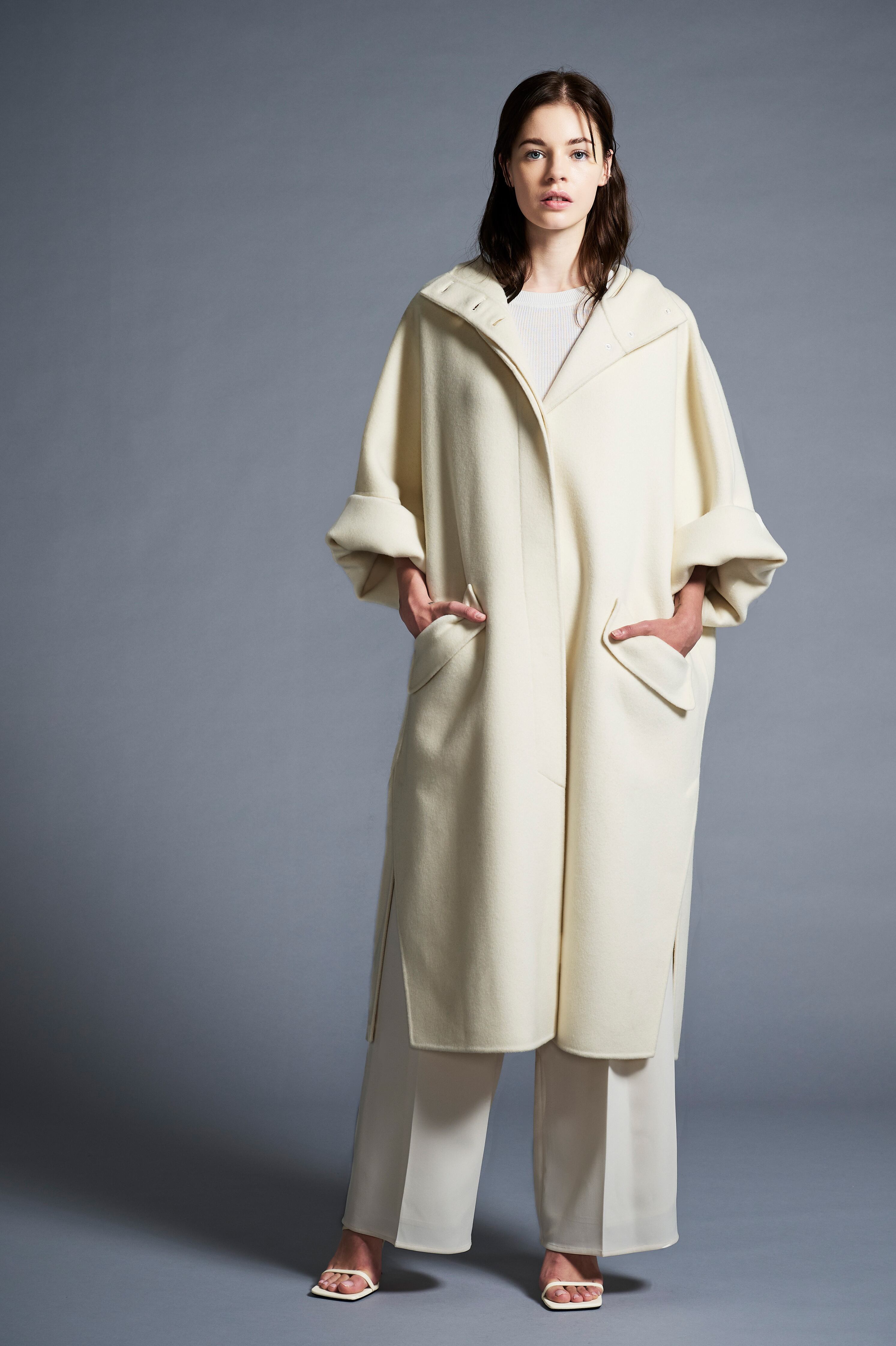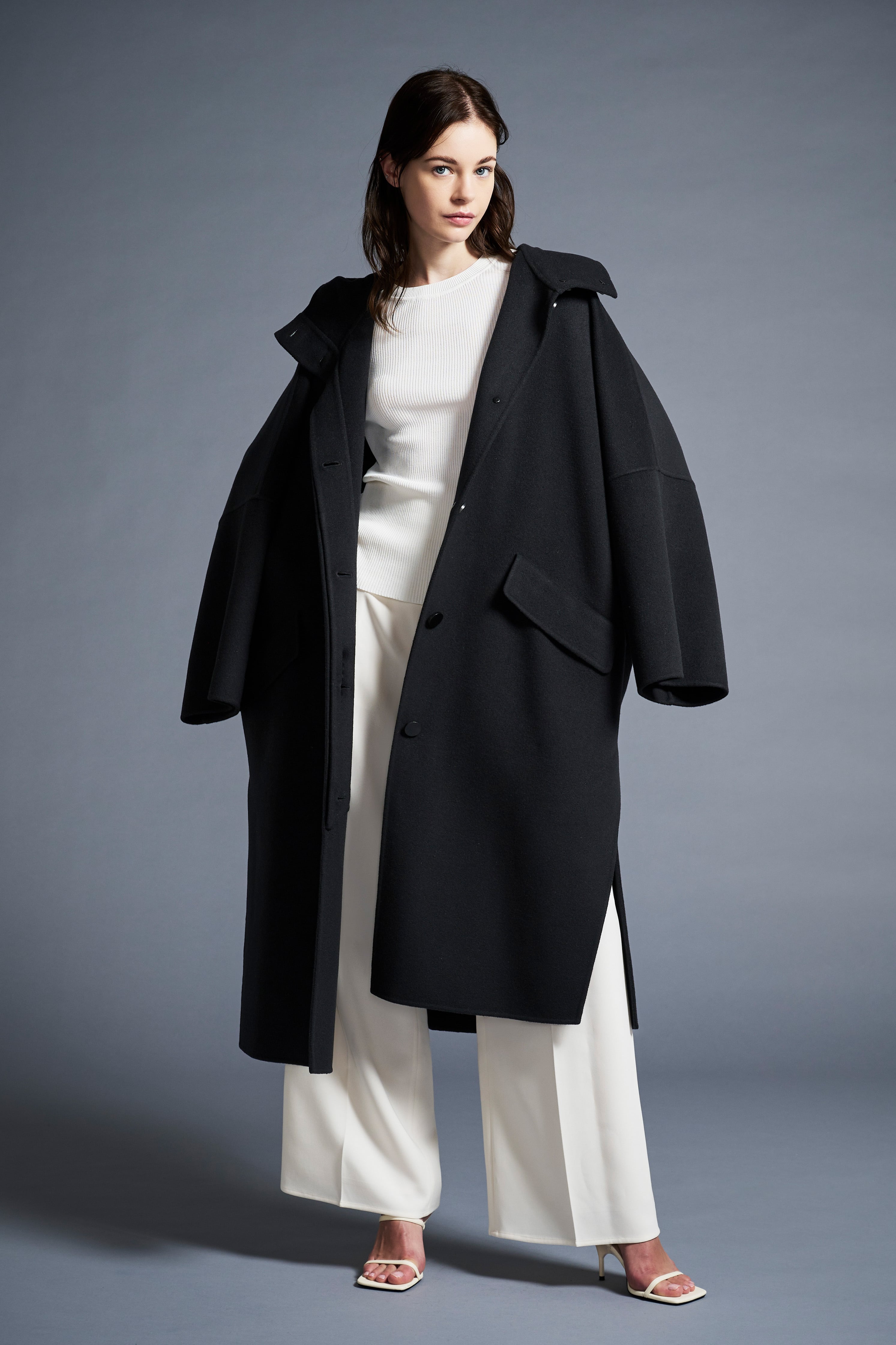 スカートでもパンツでも、どんなスタイリングにも合わせやすいロング丈コートを秋から冬まで愛用いただきたく、ロングスリーブから袖丈を折り上げることで、ショートスリーブのジレにもなるようにデザインしました。袖感を少し短くするだけで重たくなりがちな冬のスタイリングが一気にスッキリしたバランス感になります。1枚で様々な着こなしを楽しんでいただけます。