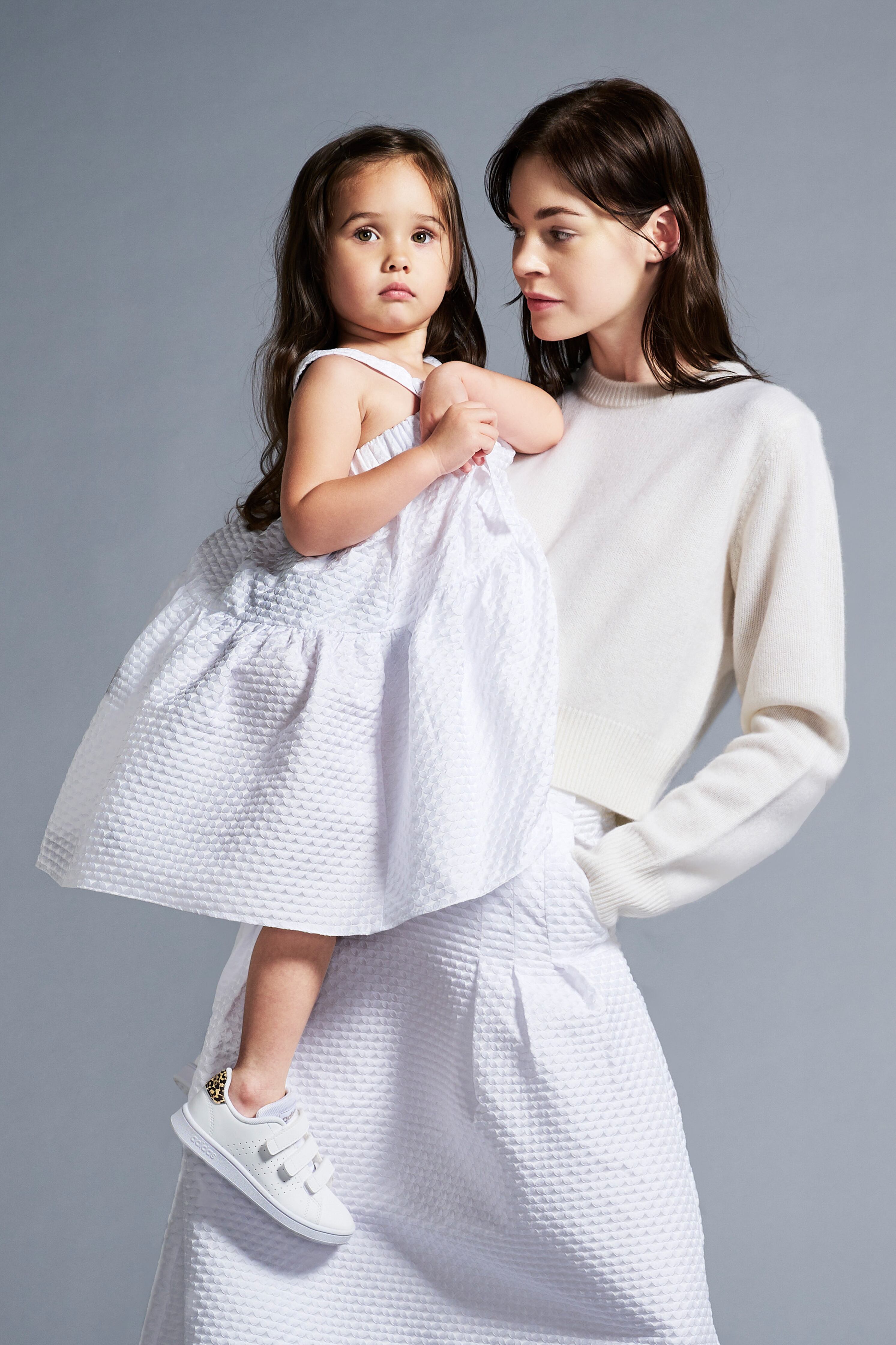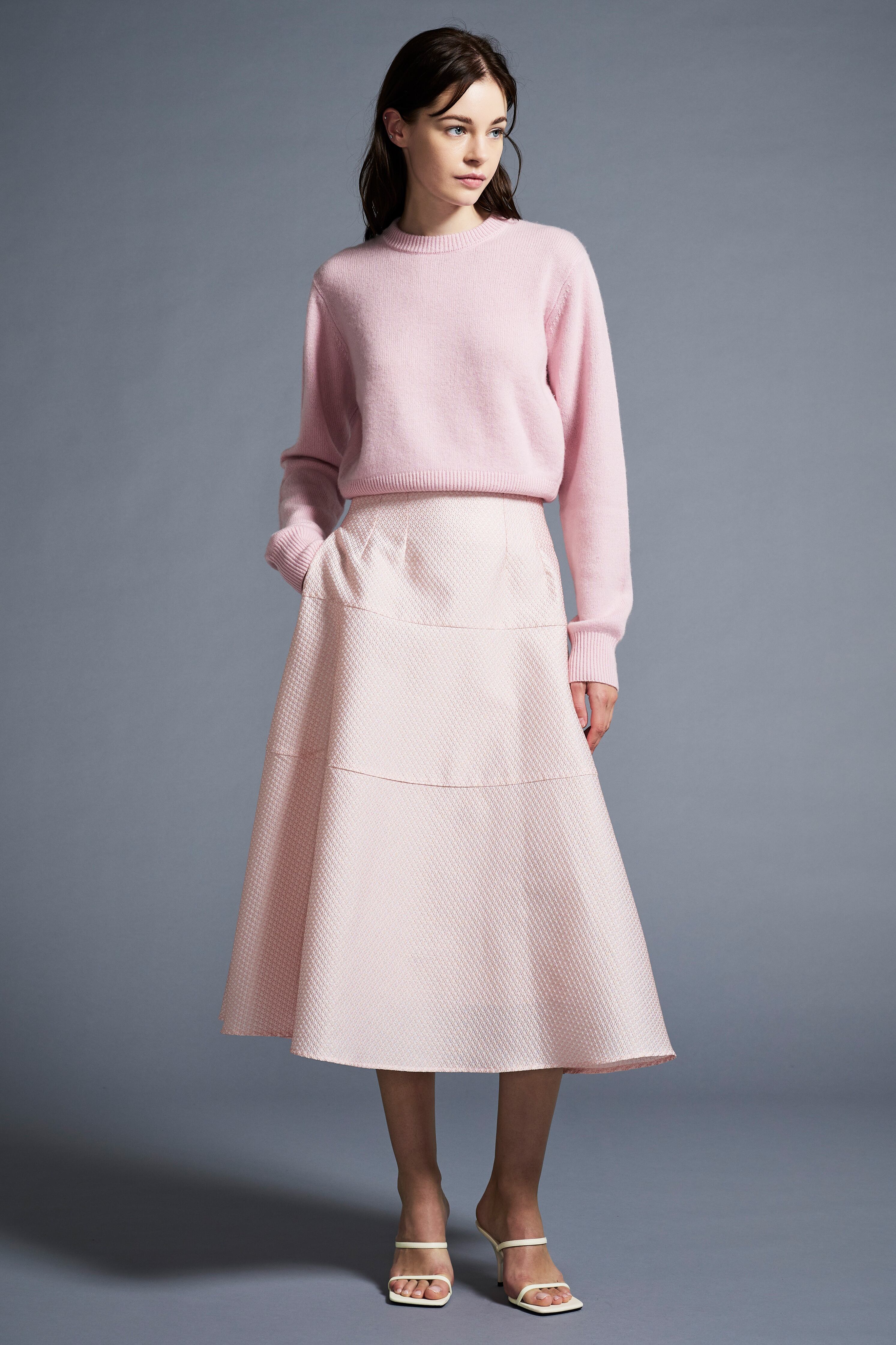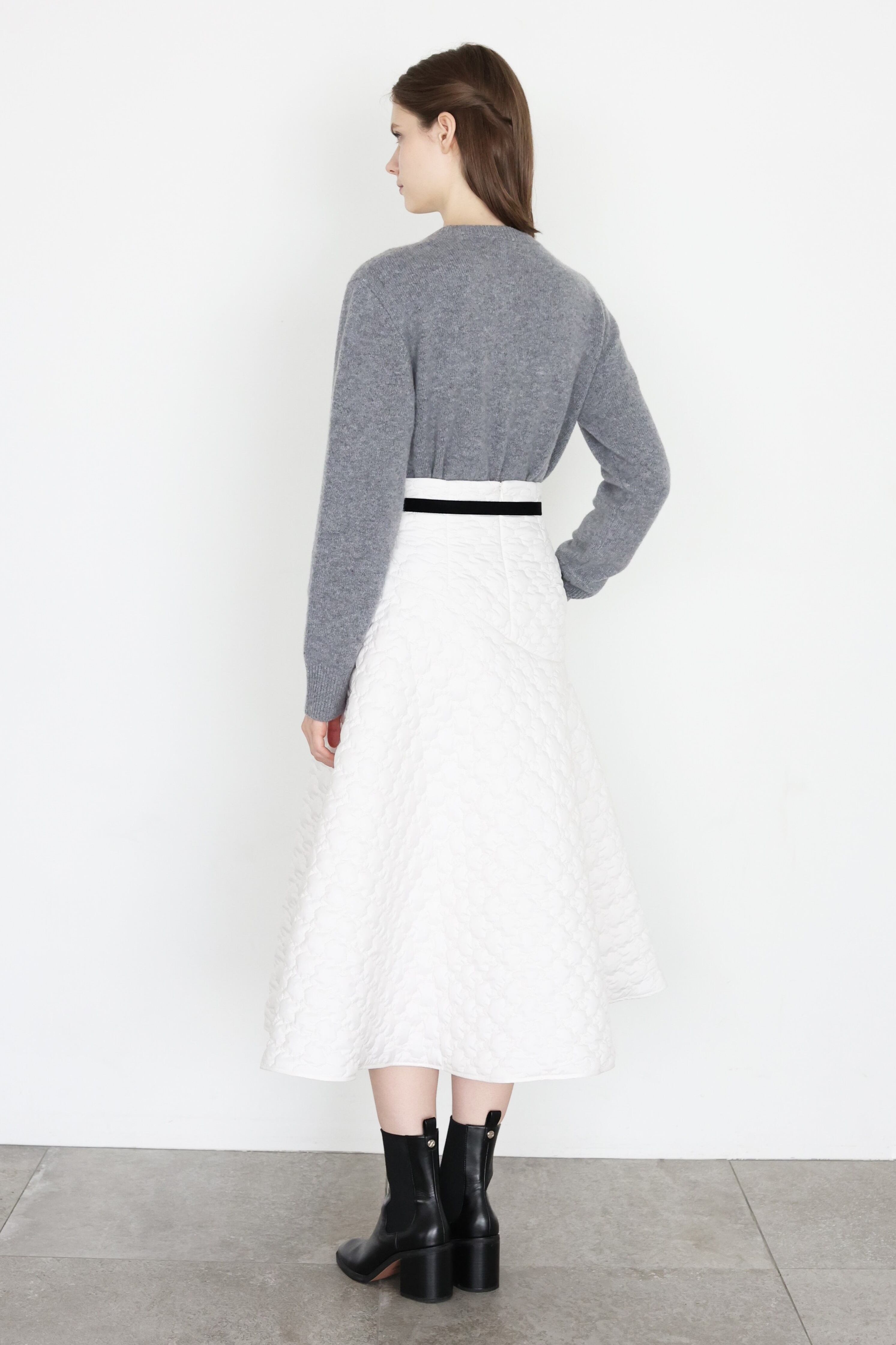 首元が詰まったマニッシュでコンパクトなショート丈はハイウエストボトムに合わせることで、脚長でスタイルアップに仕上げてくれるニットをテーマにデザインしました。
