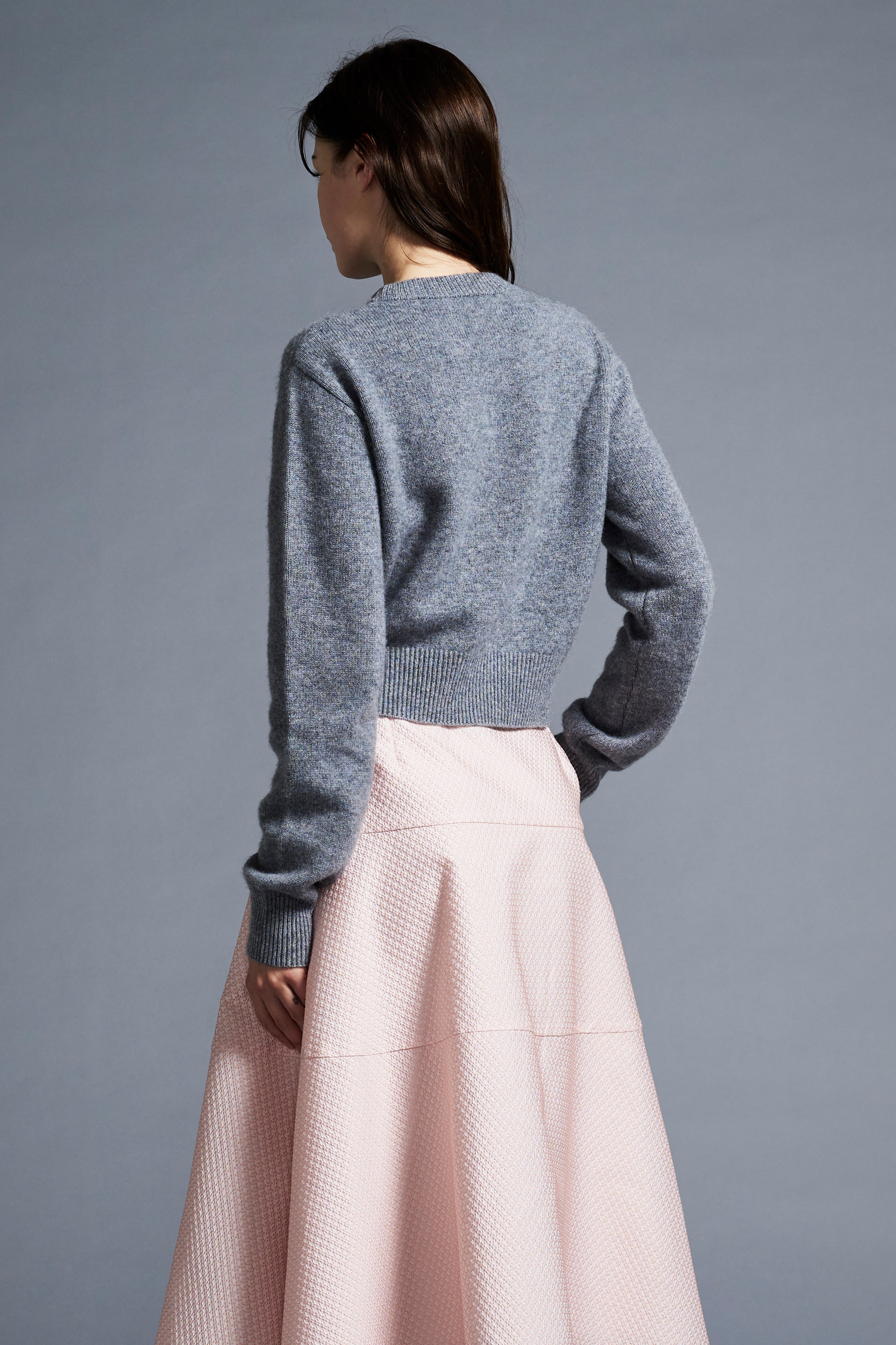 首元が詰まったマニッシュでコンパクトなショート丈はハイウエストボトムに合わせることで、脚長でスタイルアップに仕上げてくれるニットをテーマにデザインしました。