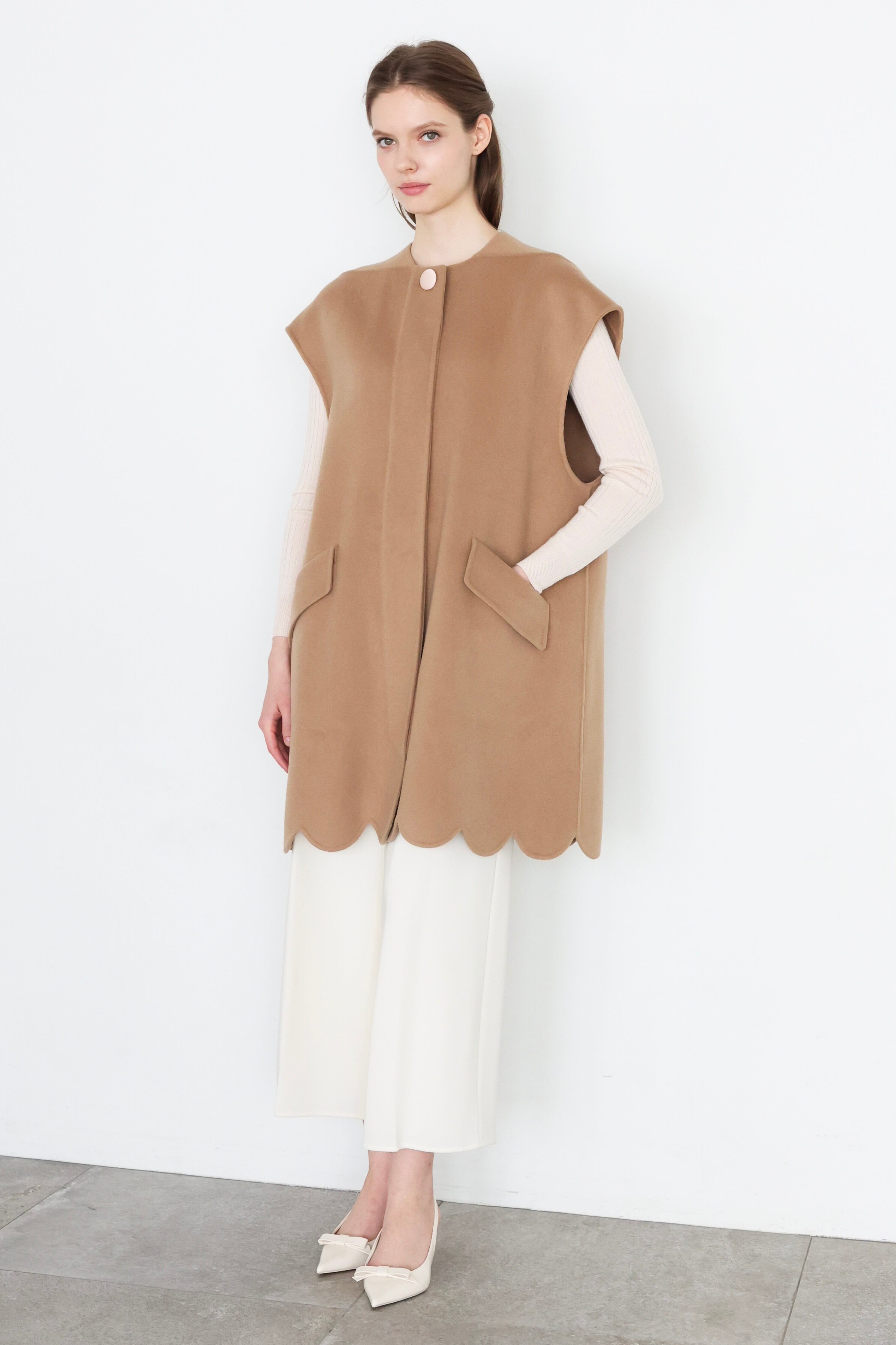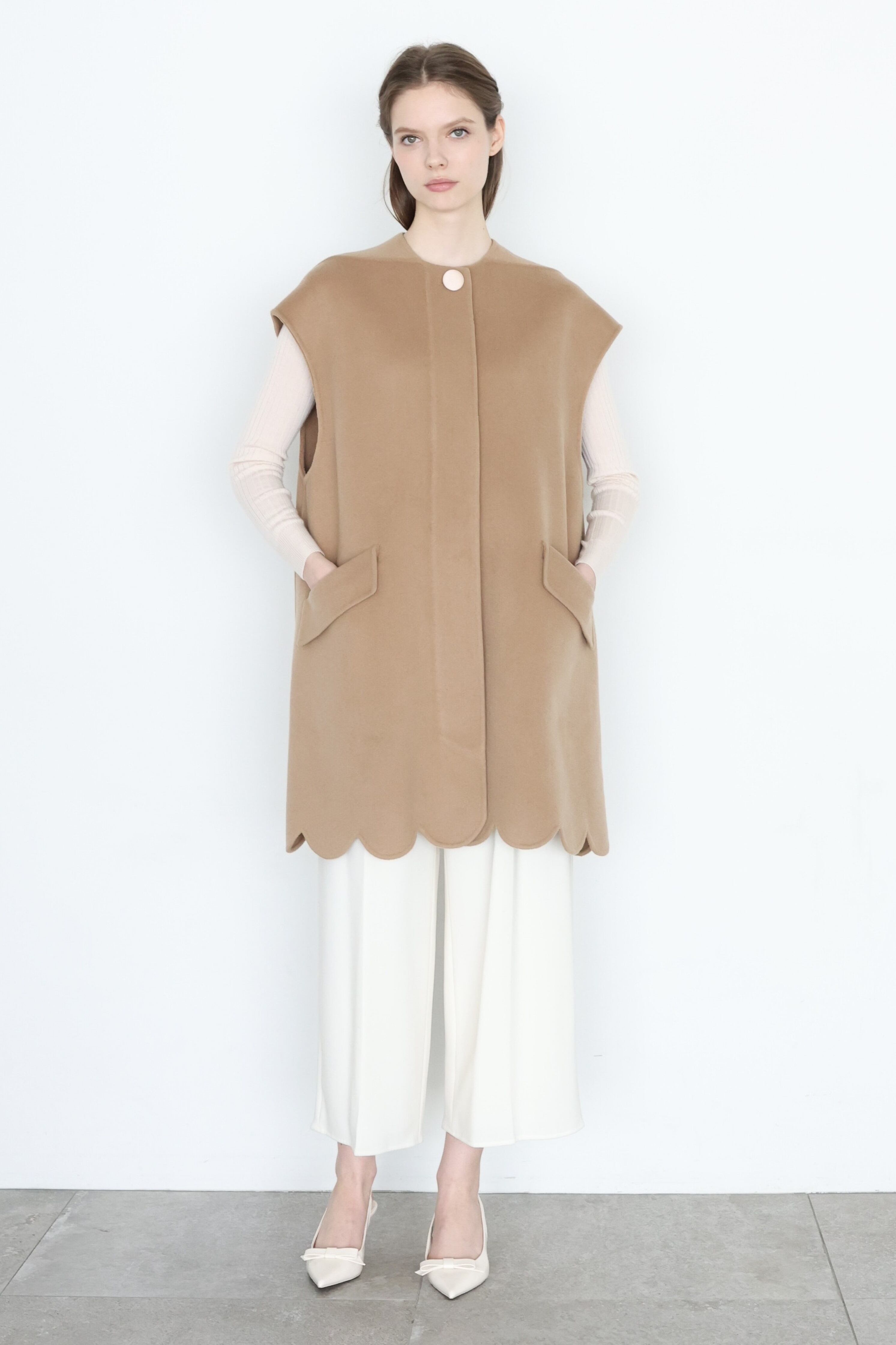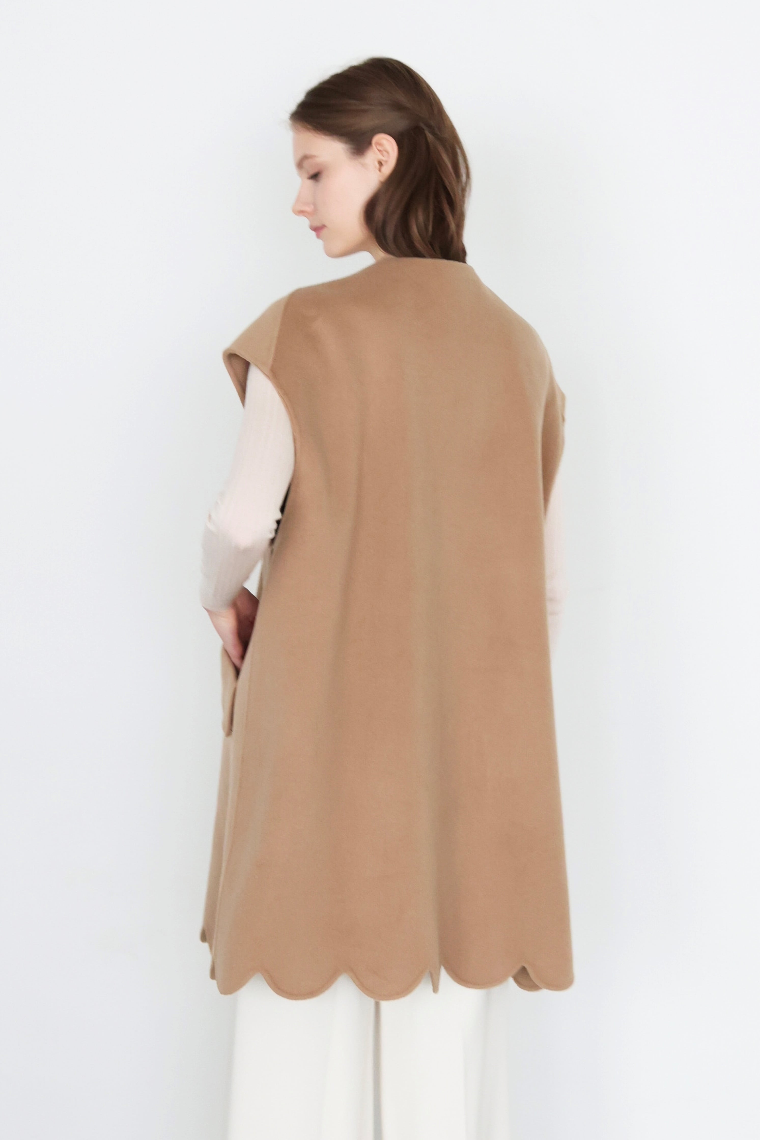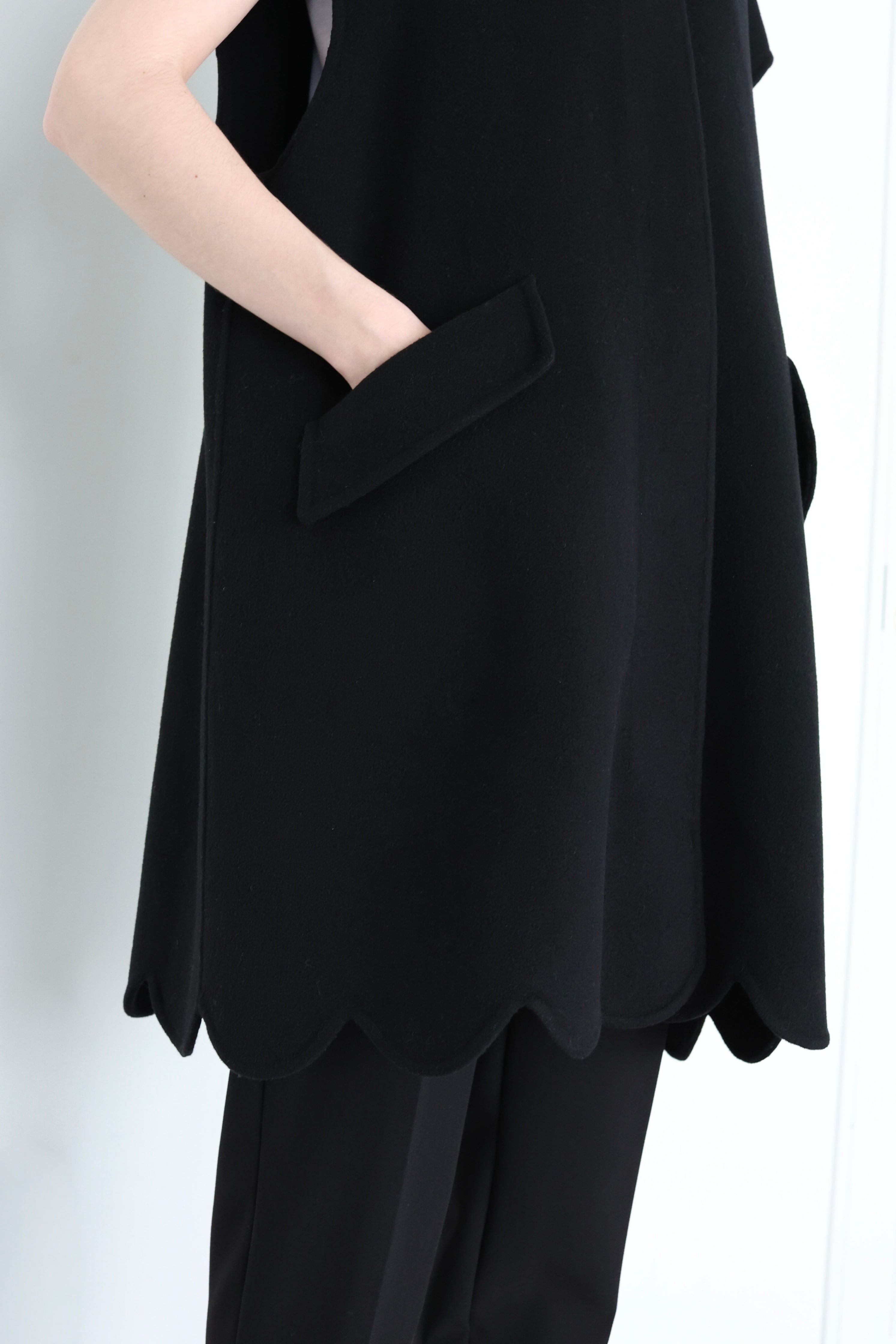 ノーカラースカラップジレ。上質でしなやかな肌触りはスーパーエクストラファイン120Sのウールをオリジナル生地。カシミヤ100%と同じ肌馴染みのよさを持ち合わせて、カシミヤより光沢感が少なく、ディリー使いができる上質な素材感。裾のスカラップがポイント。