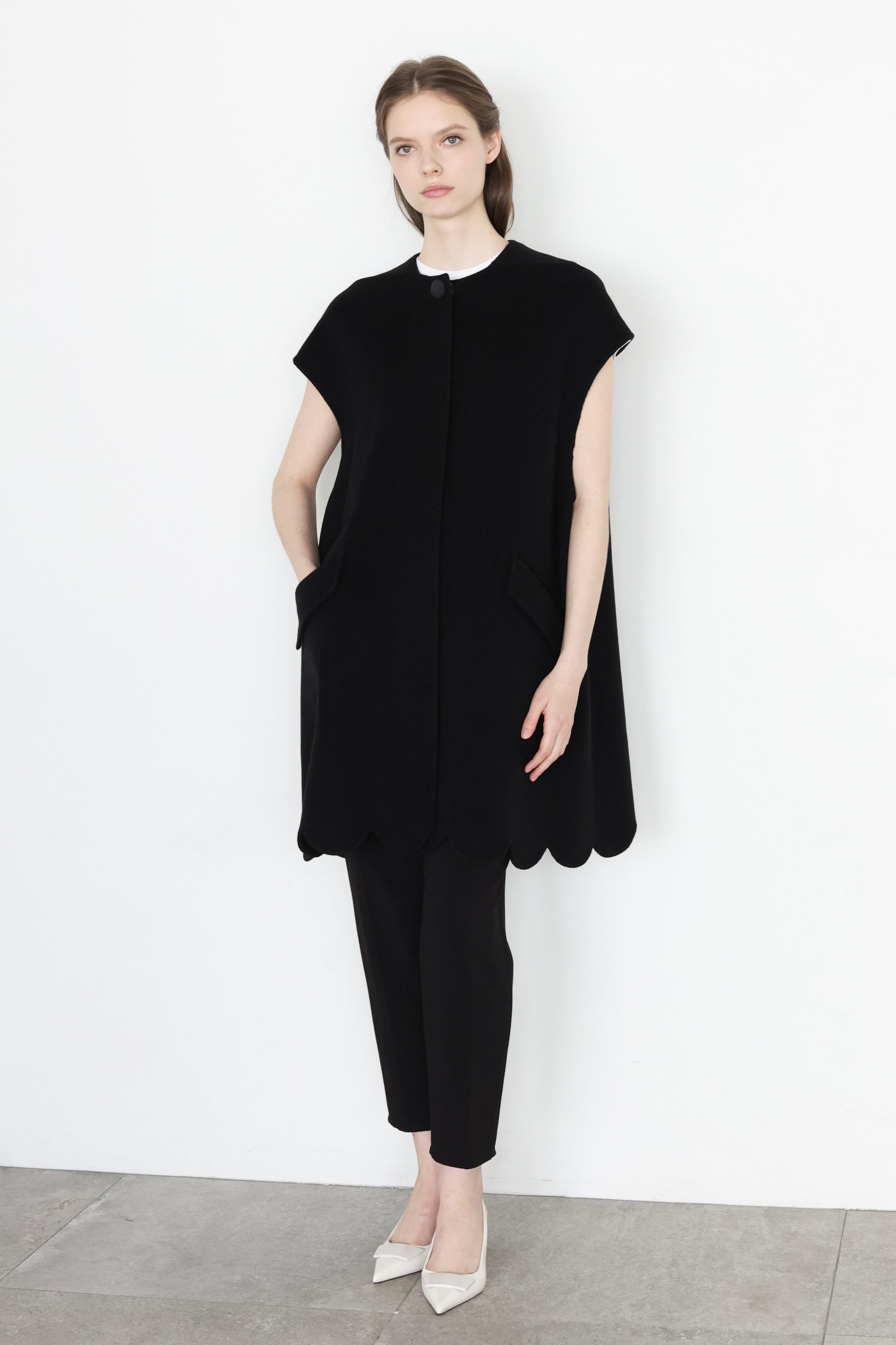 ノーカラースカラップジレ。上質でしなやかな肌触りはスーパーエクストラファイン120Sのウールをオリジナル生地。カシミヤ100%と同じ肌馴染みのよさを持ち合わせて、カシミヤより光沢感が少なく、ディリー使いができる上質な素材感。裾のスカラップがポイント。