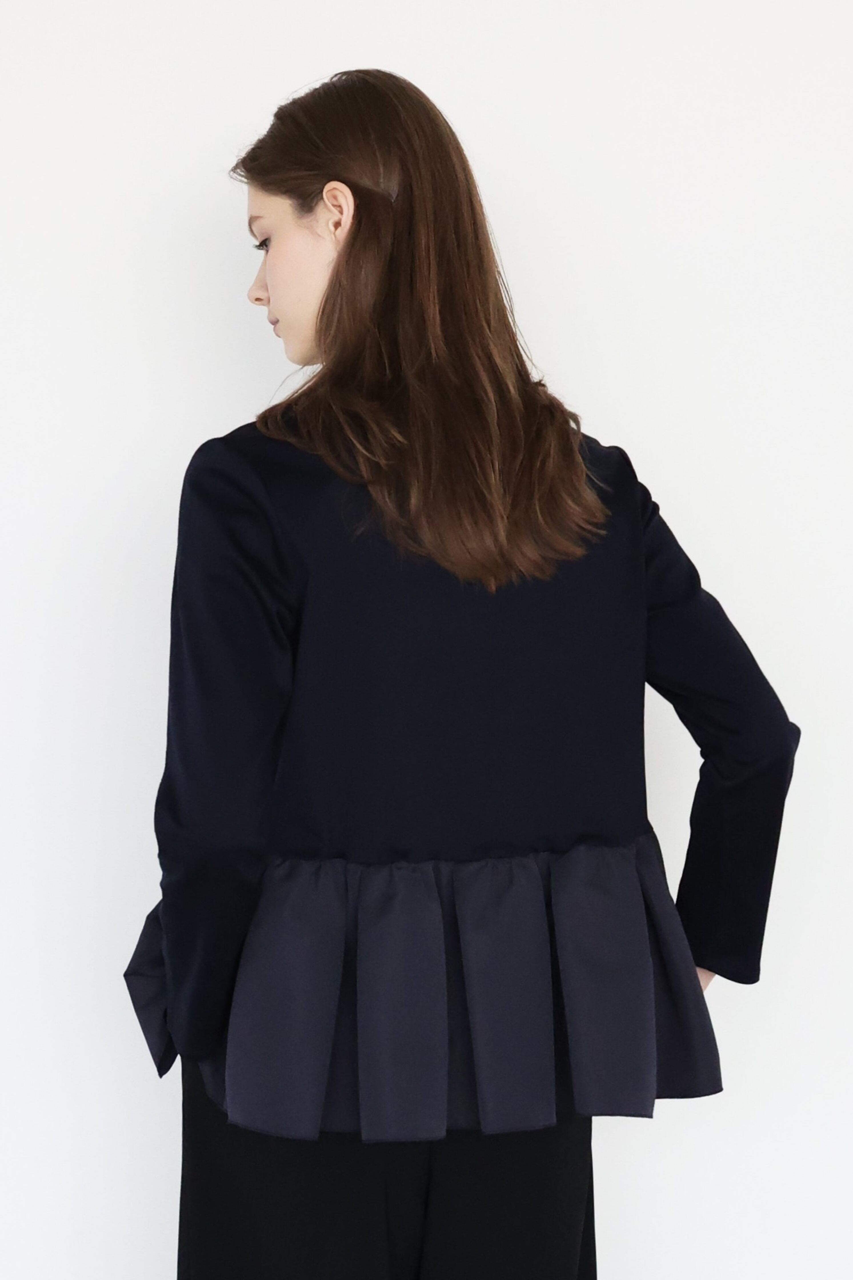 上身頃は型崩れしにくいジャージー素材を厳選、ウエスト切替からサテンのような光沢感のあるグログラン素材を使用。ワンカラーながら存在感のある着こなしに。着心地を大事にした綿100%で透けにくくジャージーはボディーラインのシルエットをひろわなく。どんなシーンでも◎。